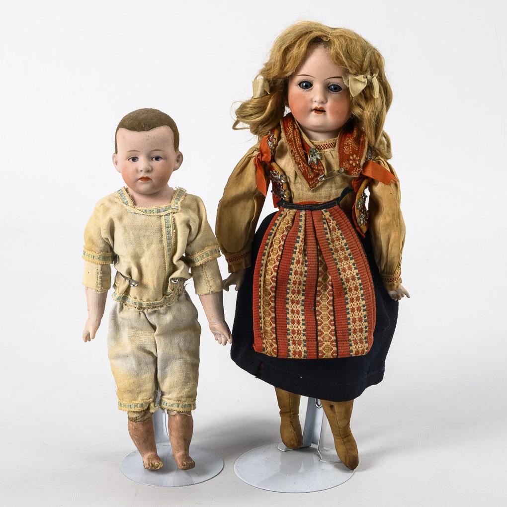 2 Brustkopf-Puppen: Vollkopf-Junge mit gemalten blauen Intaglio-Augen, Reste von feinen Haaren auf dünner lederartiger Schicht, Stoffkörper, Biskuitarmen, Massebeinen und hellem Anzug. Zehen rechts bestoßen. L 26 cm. / Blondes Mädchen (275 Heubach-Köppelsdorf) mit blauen Schlafaugen, Mohairperücke, Stoffkörper, Biskuit-Unterarmen, Kleid mit Schürze, dunkelblauem Rock und Schultertuch. Kopf durchleuchtet: ohne Defekte. L 33 cm. Altersspuren.