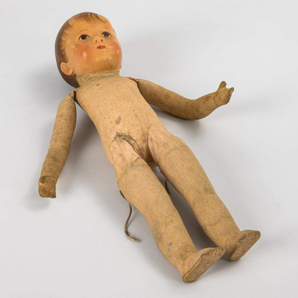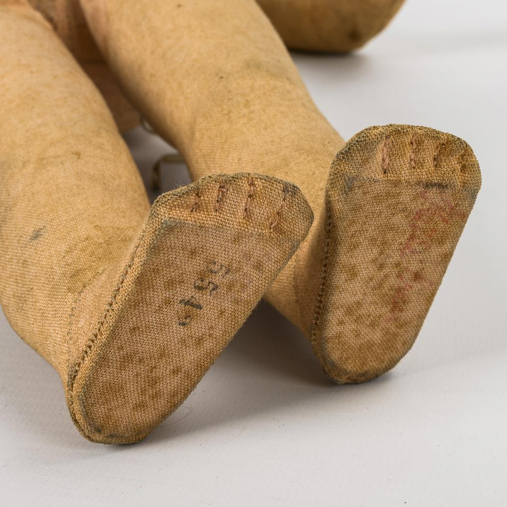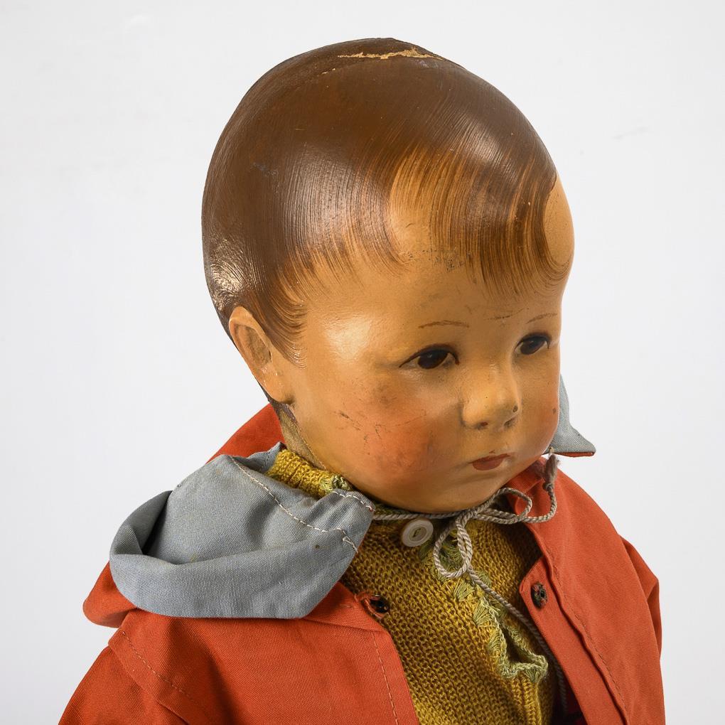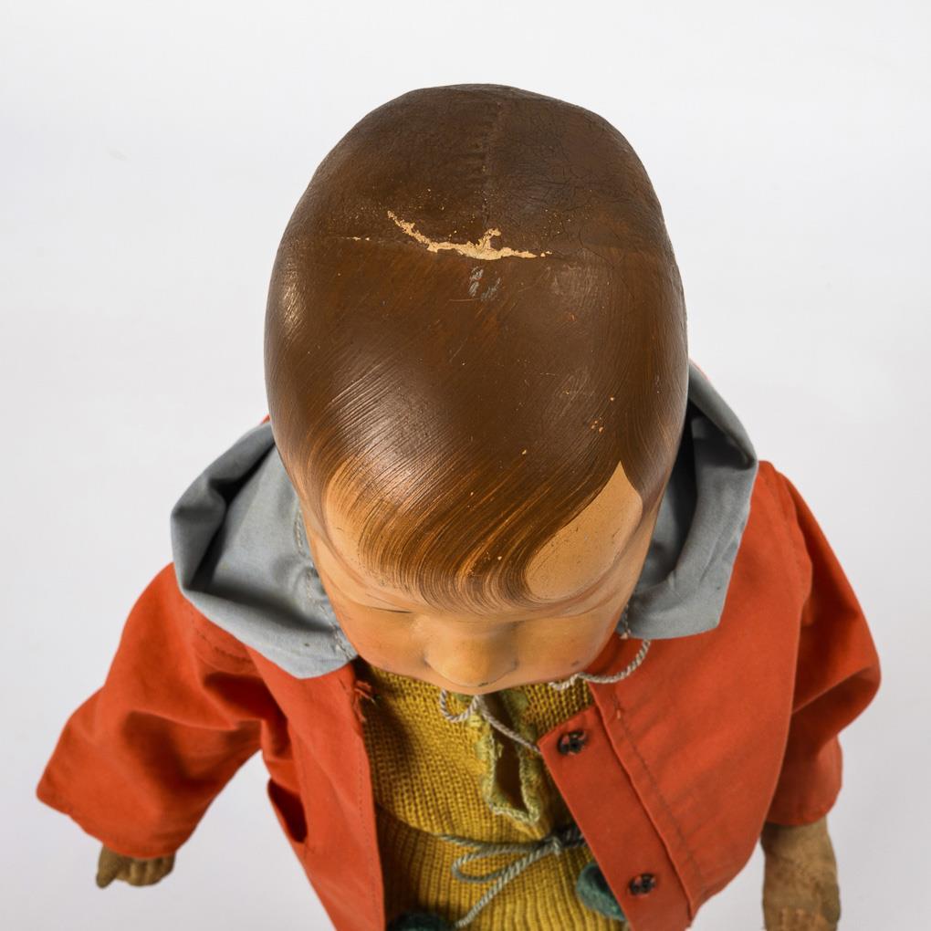 Typ XII. Bemalter Stoffkopf mit braunen Augen, gemalten Haaren und 3 Hinterkopfnähten. Stoffkörper mit lockeren Hampelchenbeinen, defekten Bändchen und Knopf im Rücken. Roter Mantel, passende Kapuze, beigefarbene Cordhose, braune Schuhe. Farbdefekte an Kopf und Nasenspitze, Körper fleckig.