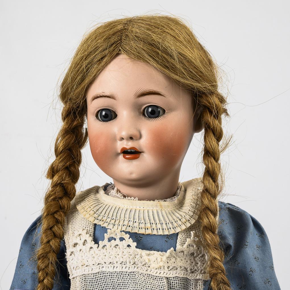Kurbelkopf, blaue Schlafaugen, offene Nasenlöcher, dunkelblonde Echthaarperücke. 15-teiliger Gliederkörper. Blaues Kleid, bestickte Schürze, rote Kunststoffschuhe. Kopf durchleuchtet: ohne Risse, lediglich kleiner Chip am linken Auge. Hände und Füße übermalt (wohl mit Reparaturen).