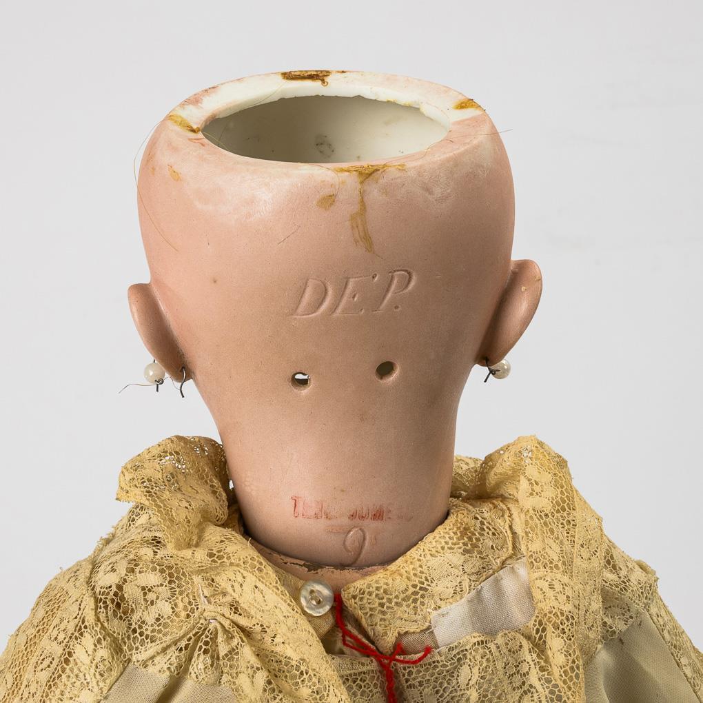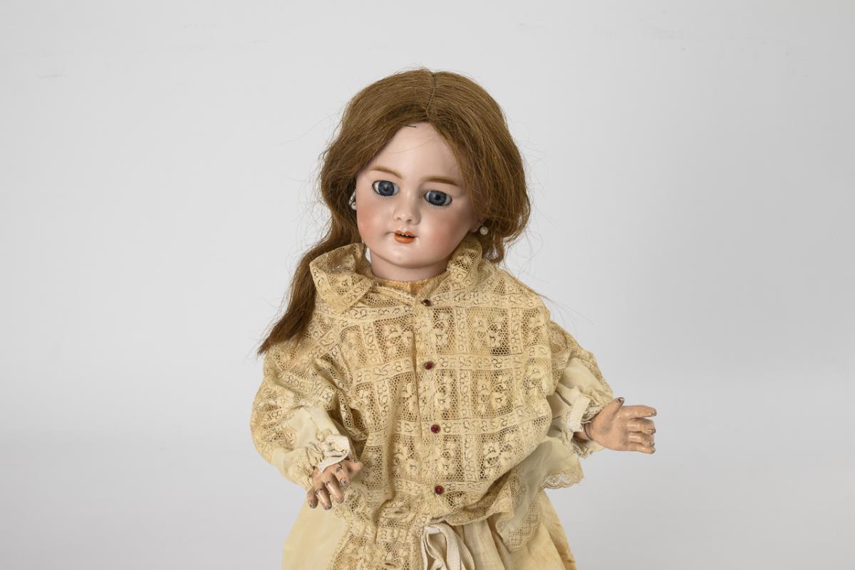Kurbelkopf, blaue Schlafaugen, Ohrringe, braune Echthaarperücke. 11-teiliger Gliederkörper mit leiser Stimme. Cremefarbenes Kleid, hellbraune Lederschuhe. Kopf durchleuchtet: ohne Risse, lediglich winziger Chip am linken oberen Augenrand. Körper mit Farbdefekten.