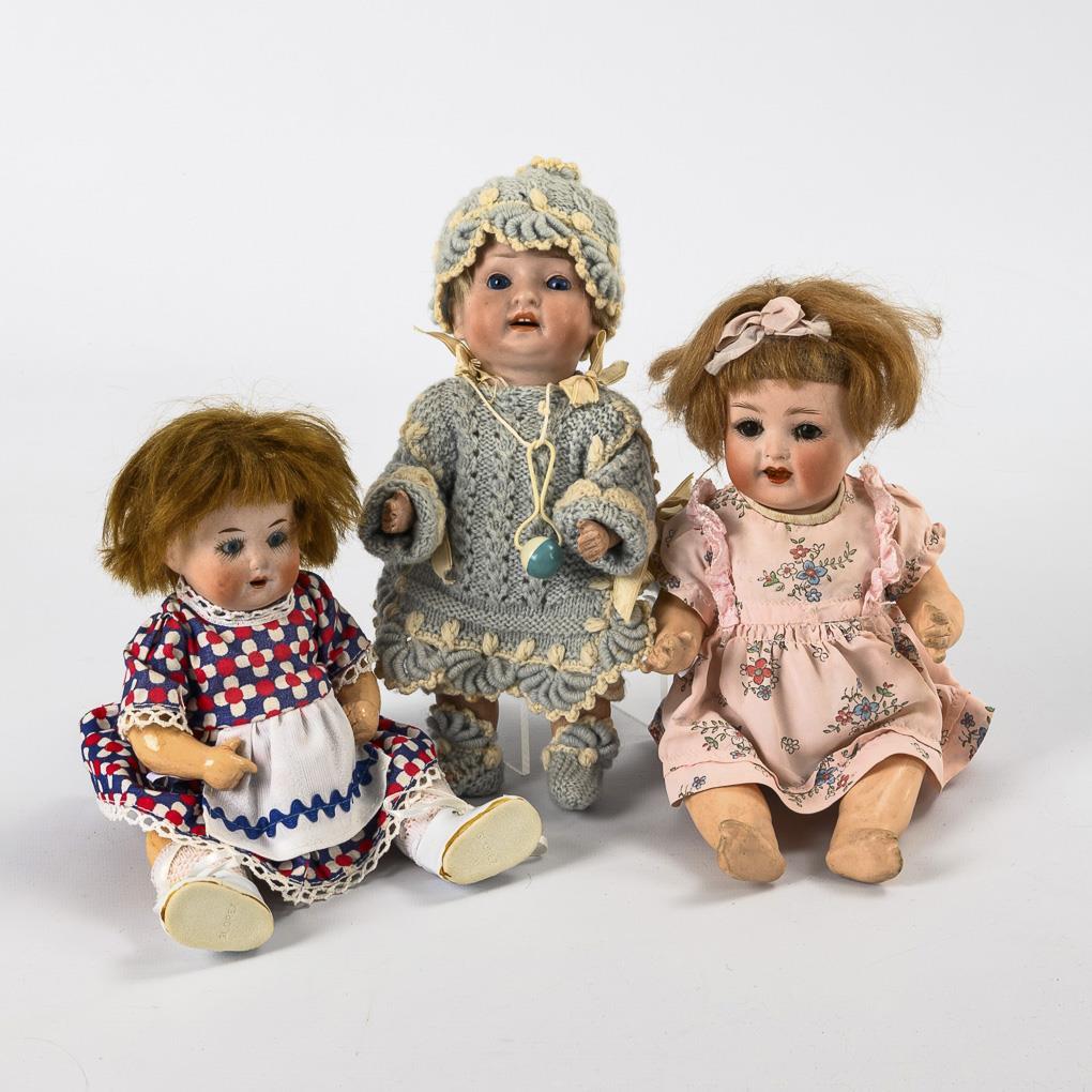 Alle mit Kurbelkopf, Mohairperücke und 5-teiligem Sitzbabykörper. Köpfe durchleuchtet: ohne Defekte, 1x minimal brandrissig an Auge und Mundwinkeln.