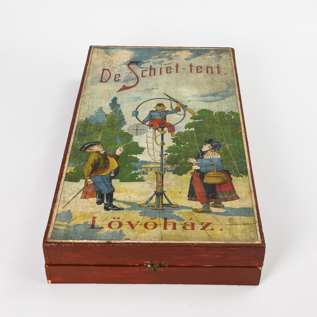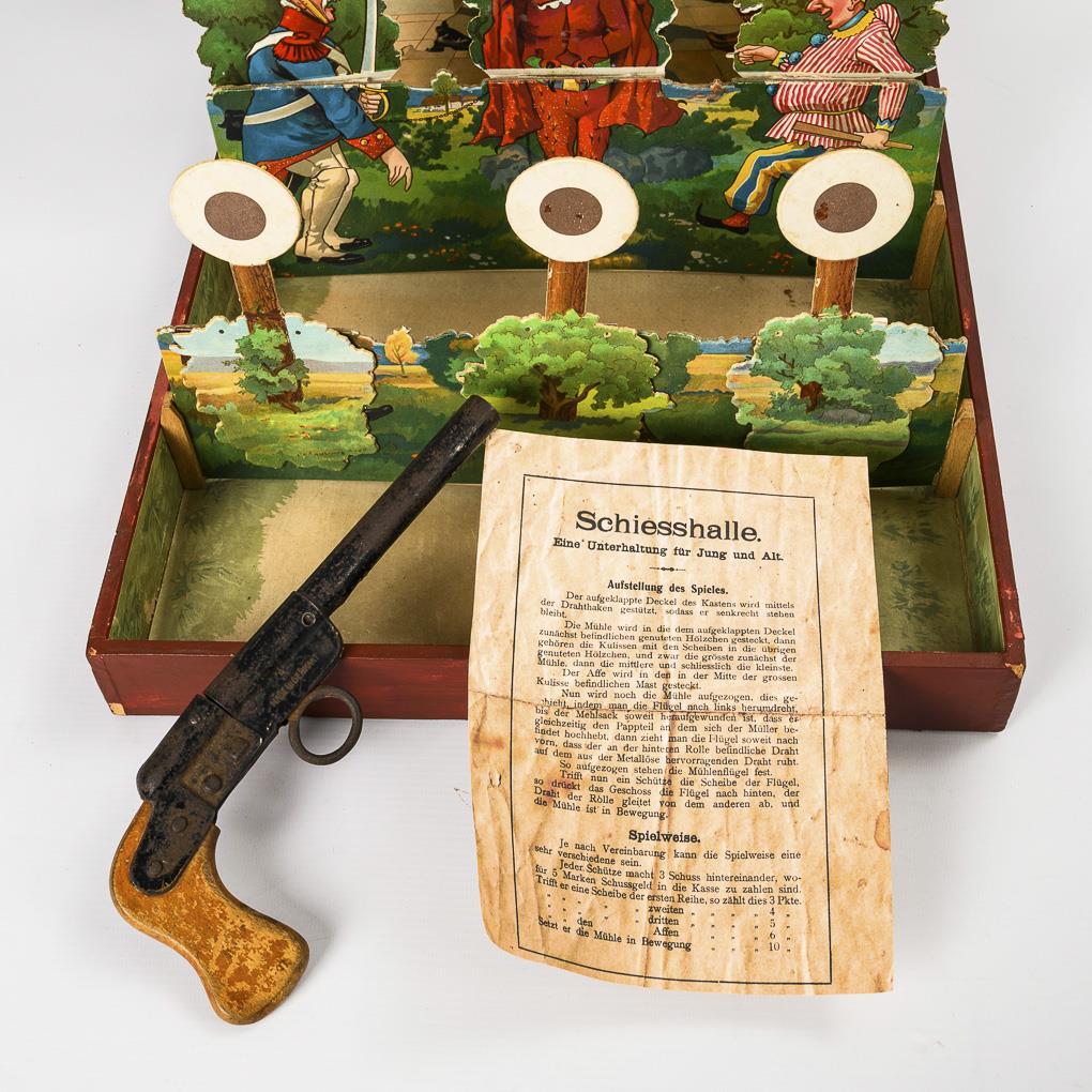 Schiess-Spiel mit festem, aufstellbaren Kasten, großer Papp-Windmühle und mehreren Zielen. Dazu Pistole "Ideal" und Kopie der originalen Anleitung in deutscher Sprache "Schiesshalle. Eine Unterhaltung für Jung und Alt". Teils kleine Defekte und Verstärkungen aus Pappe, doch insgesamt recht guter Erhaltungszustand.