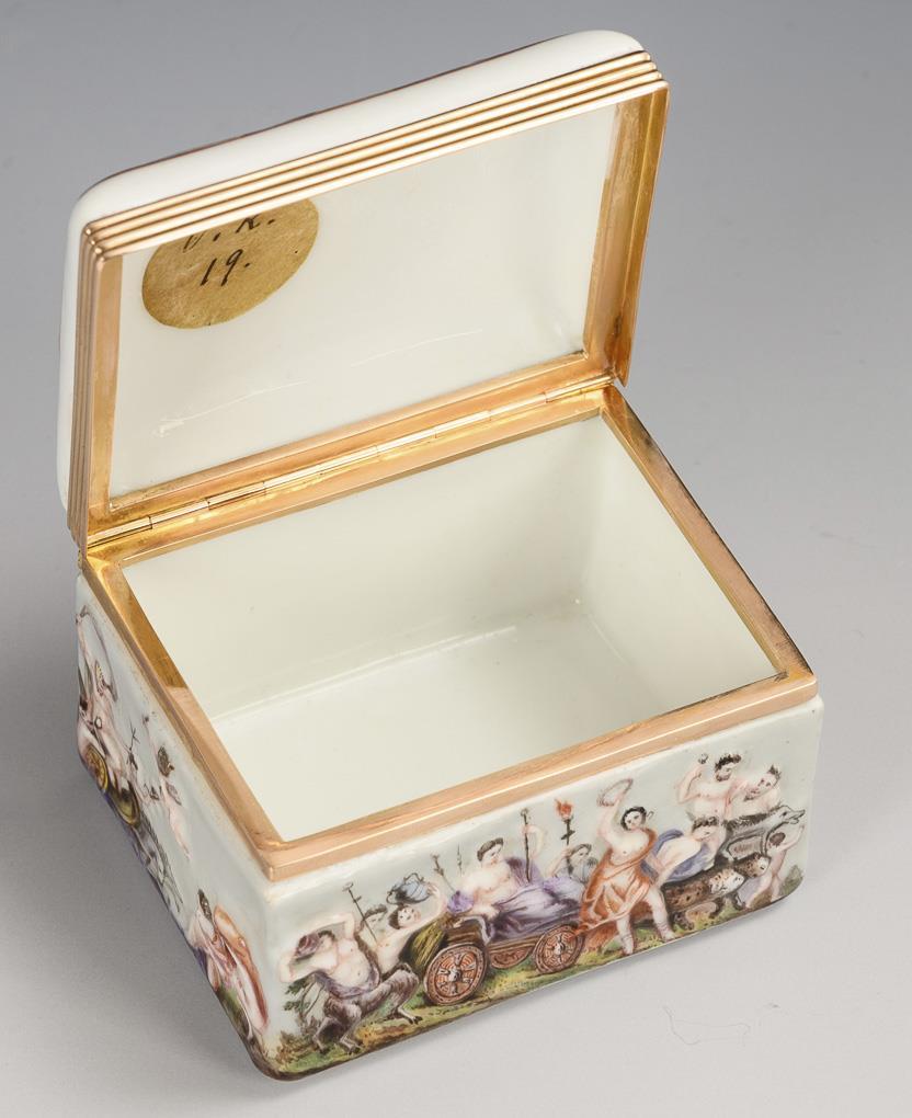 Rechteckige Dose mit goldmontiertem Scharnierdeckel (585 Roségold, geprüft). Allseitig sowie auf dem Deckel mythologische Reliefdarstellungen. Im Deckel altes Etikett "V. K. 19", an einer Deckelseite ein Etikett mit der Ziffer "No 163".