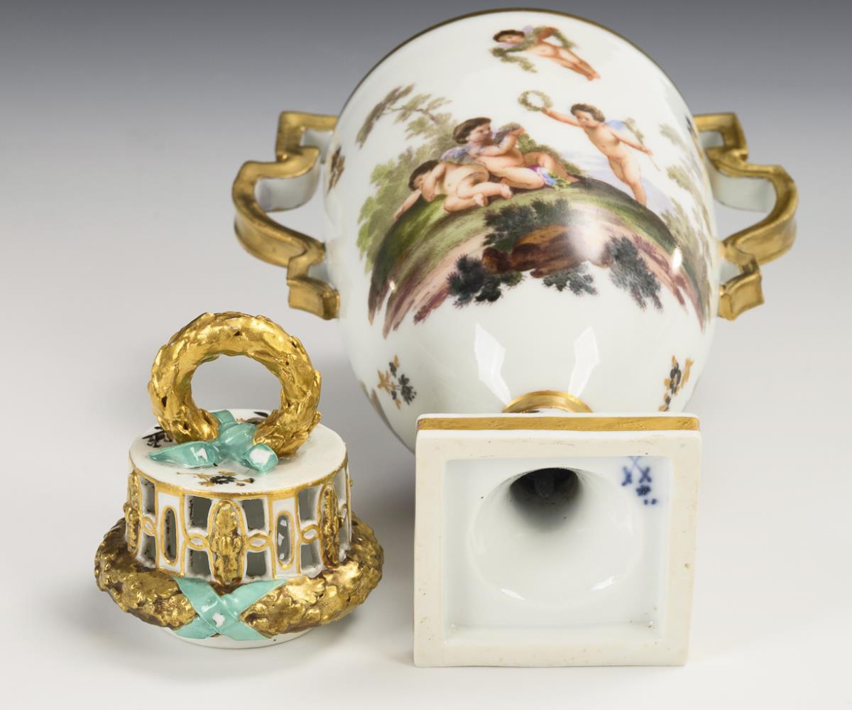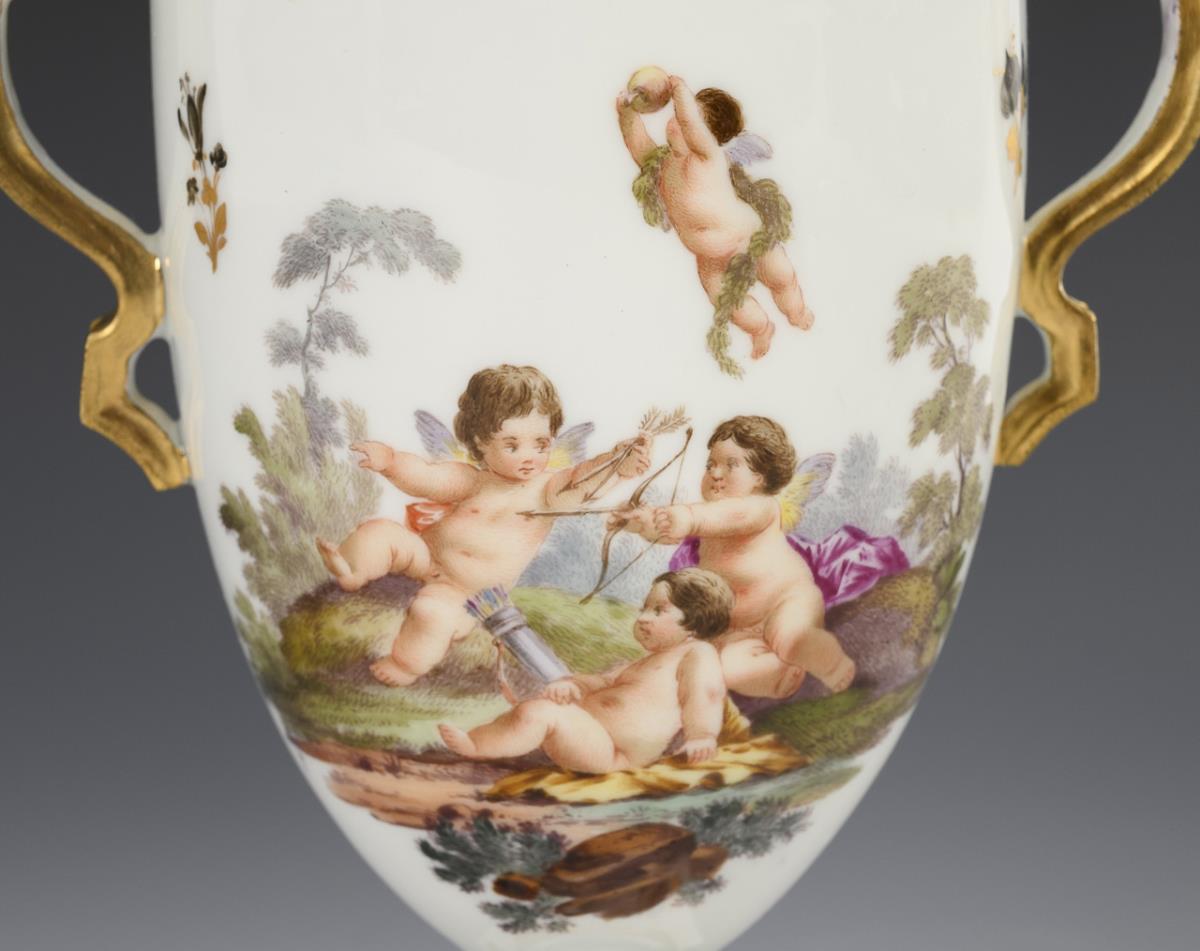 Halbovoider Korpus mit zwei gewinkelten Henkeln, durchbrochenem Deckel mit Lorbeerkranzgriff, Rundfuß und Plinthe. Beidseitig die Darstellung von je vier Putten in einer Landschaft. Beide Henkel restauriert und teils nachvergoldet.
