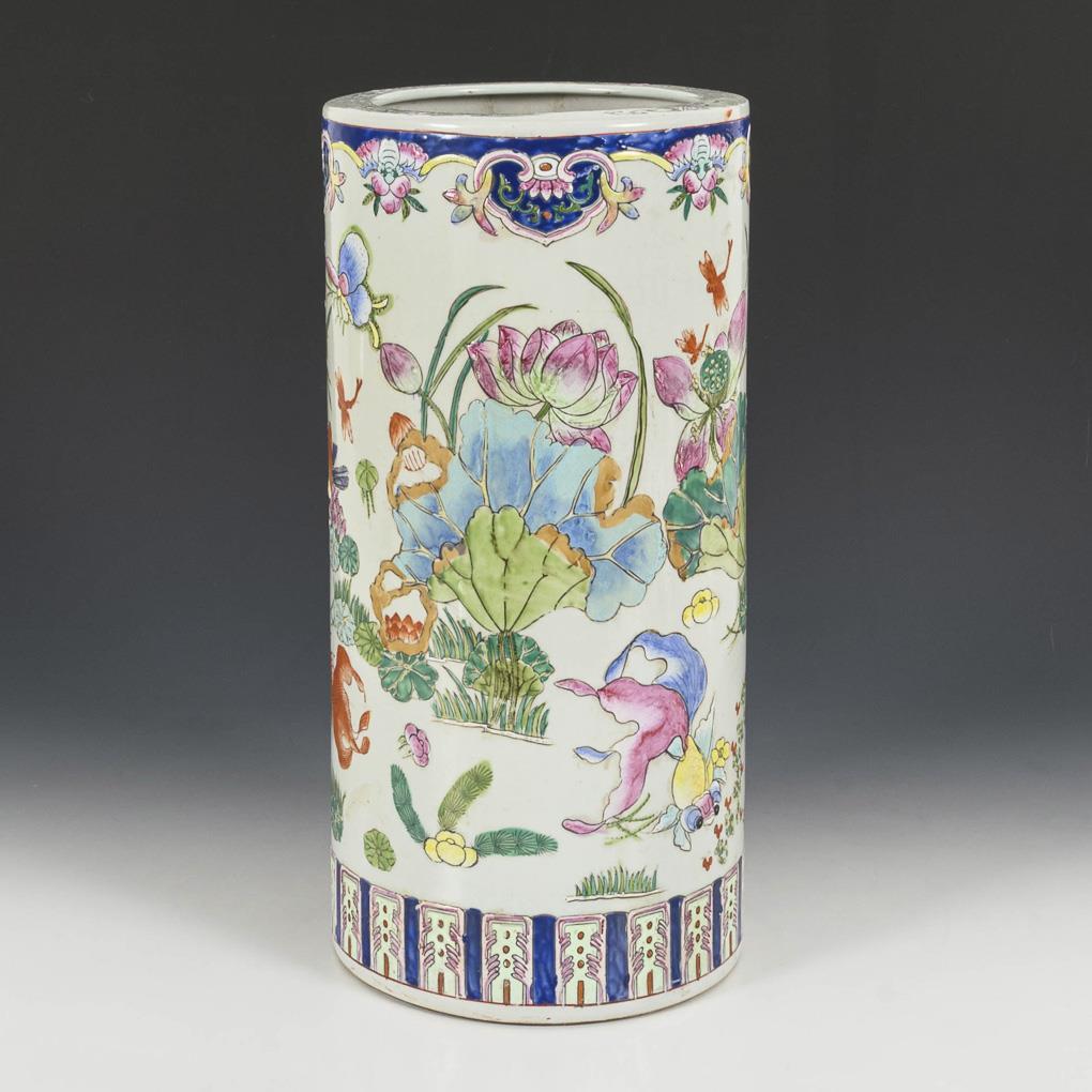 Zylindrische Form mit kleinem, geradem Innenrand. Wasserpflanzen, Fische und Enten in polychromer Emailbemalung.
