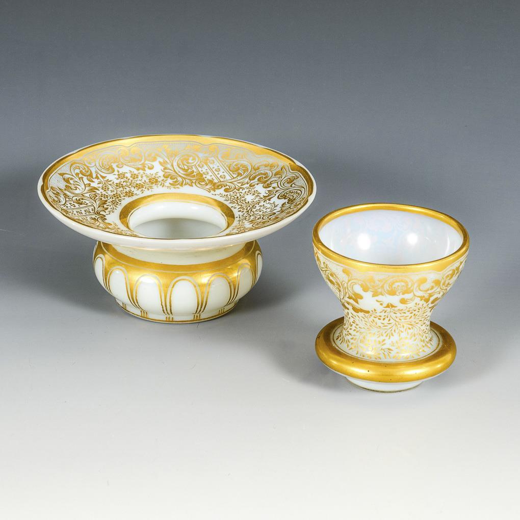 Gedrückt gebauchte Schale mit breiter Fahne sowie originaler, auf den Napf aufsetzbarer Glockenbecher. Reiche ornamental-florale Goldmalerei. Minimaler Goldabrieb.