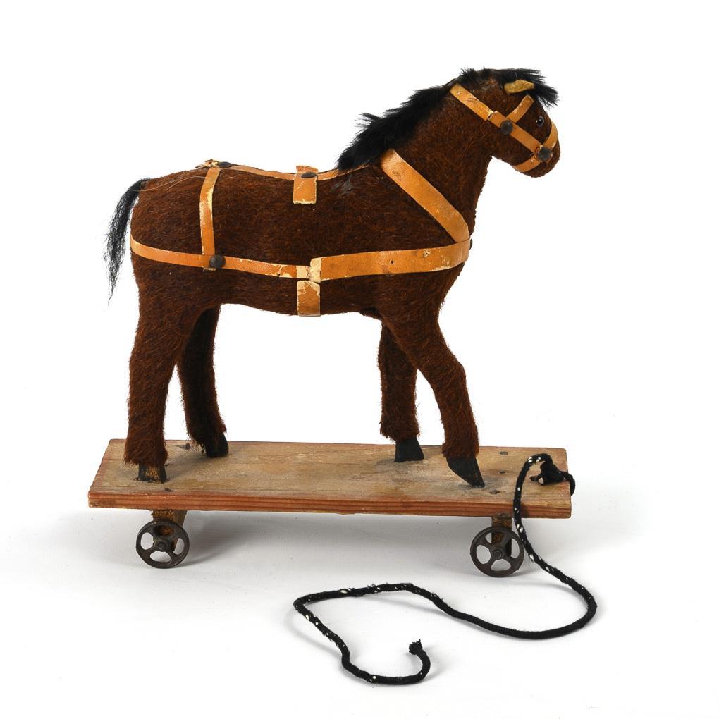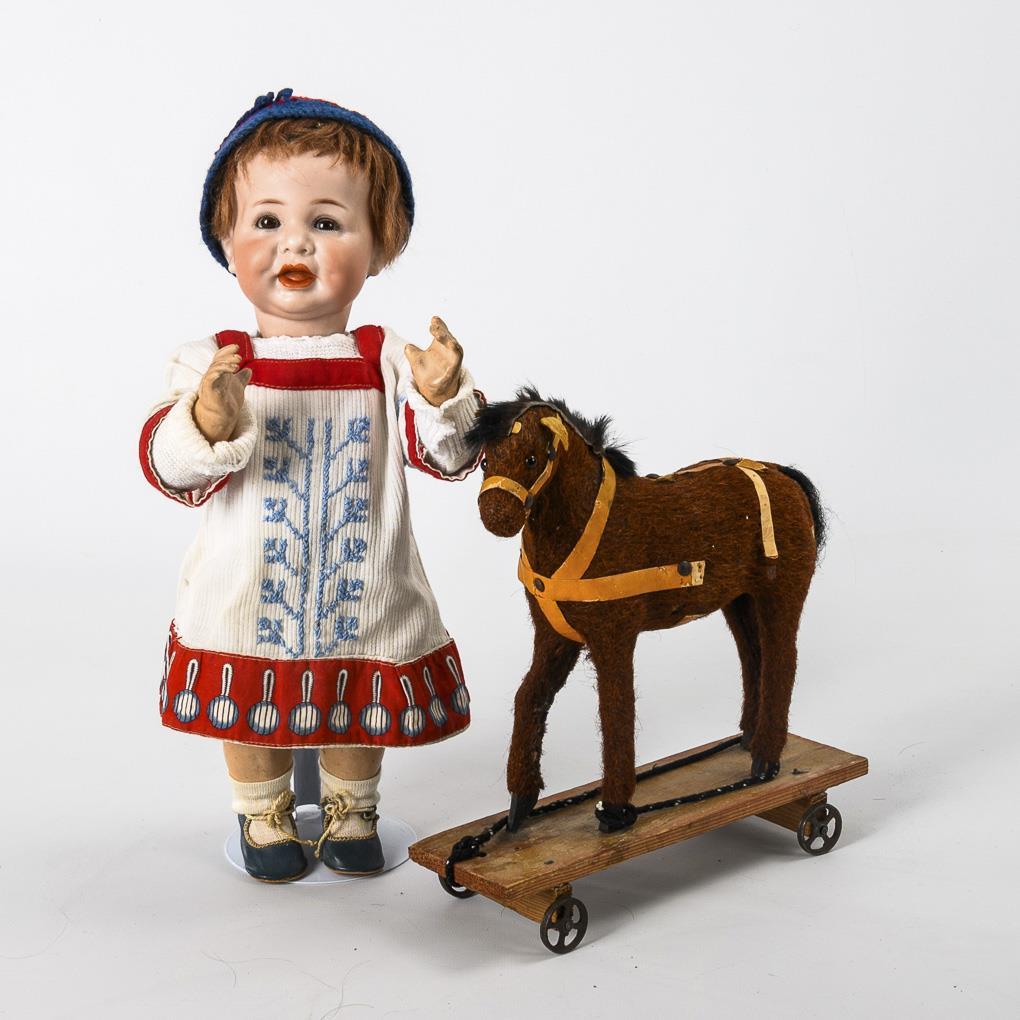 Defekte Babypuppe mit Kurbelkopf, braunen Schlafaugen, offen/geschlossenem Mund und rotbrauner Mohairperücke. 5-teiliger Stehpuppenkörper. Weißes Kleid mit roten Borten und blauer Stickerei, Häkelmütze, blaue Wachstuchschuhe. Geklebter Ausbruch am Hinterkopf, kleine Reparatur am linken Auge. L 35 cm. Dazu braunes Pferdchen mit Kunstfell, auf Räderplatte (23 x 23 x 8 cm).