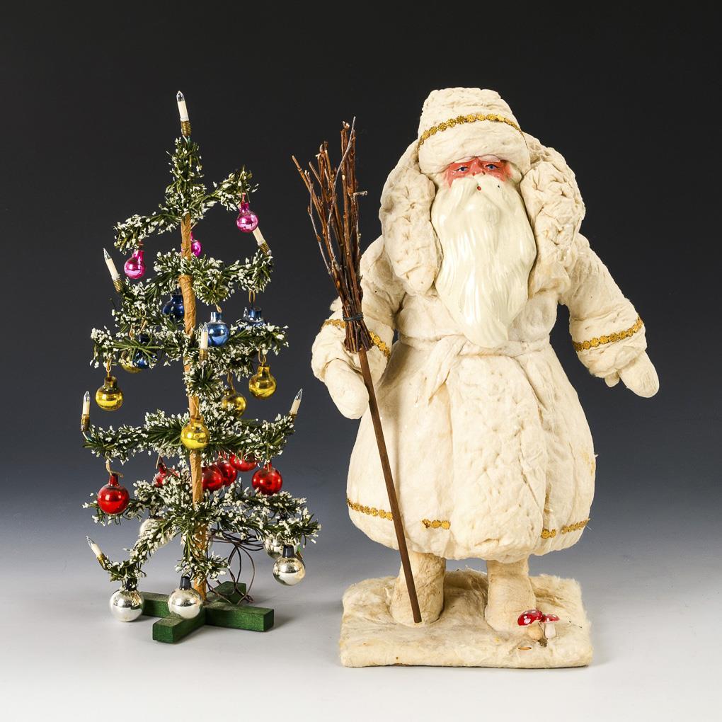 Wattefigur mit modelliertem, bärtigem Massegesicht als Väterchen Frost. / Geschmückter Weihnachtsbaum mit bunten Kugeln und elektrischer Beleuchtung, Funktion nicht geprüft. Leichte Altersspuren, Goldborte am Mantel mit Defekten.