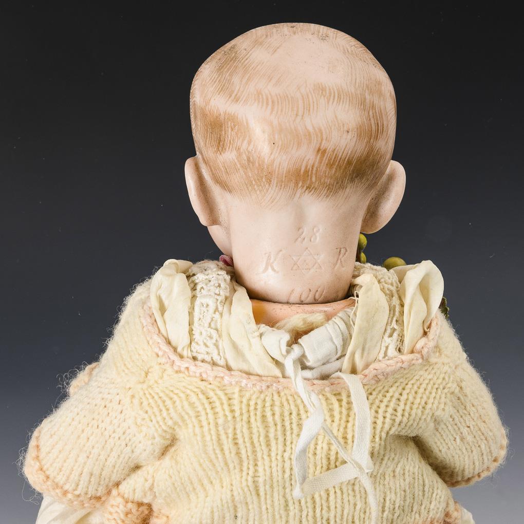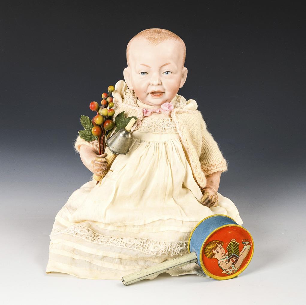 Sogenanntes "Kaiserbaby" mit Vollkopf, gemalten blauen Augen, offen-geschlossenem Mund, 5-teiligem Sitzbabykörper, weißem Kleid und Strickjacke. Kopf ohne Defekte, Körper berieben. L 28 cm. Dazu 2 Rasseln und ovales Flechtkörbchen.