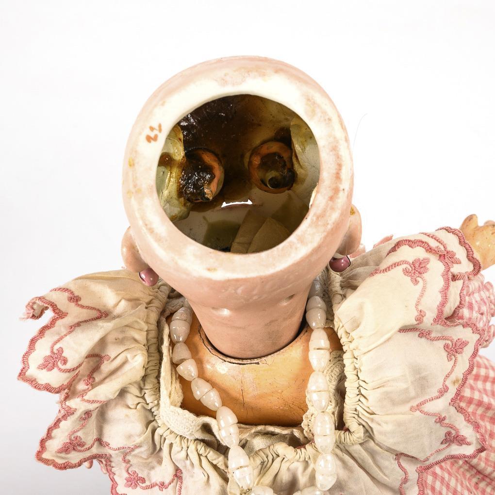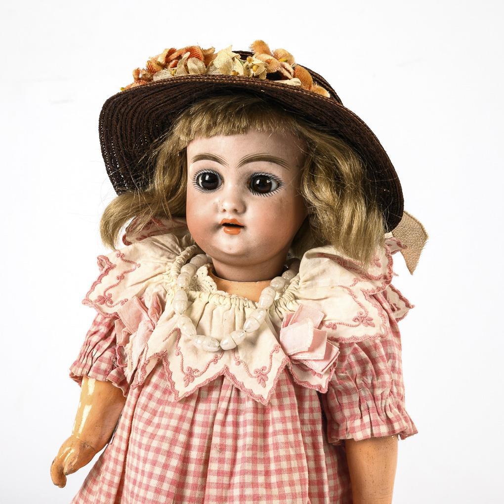 Kurbelkopf, nachgegipste braune Glasaugen, Ohrringe, blonde Mohairperücke. 11-teiliger Gliederkörper. Rosa-kariertes Kleid, brauner Strohhut, braune Lederstiefel. Kopf durchleuchtet: ohne Defekte. Körper mit winzigen Farbdefekten.