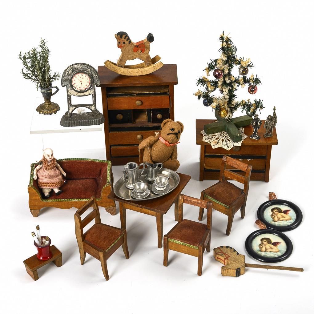 9 Möbelchen aus dunklem Holz: Schrank, Sofa, Tisch, 4 Stühle, Schemel und Kommode, H 1,5 – 9 cm. Dazu einige Teile Zubehör, darunter Zinn, Weihnachtsbäumchen (H 9 cm), Schaukelpferd, 2 Wandbilder etc.