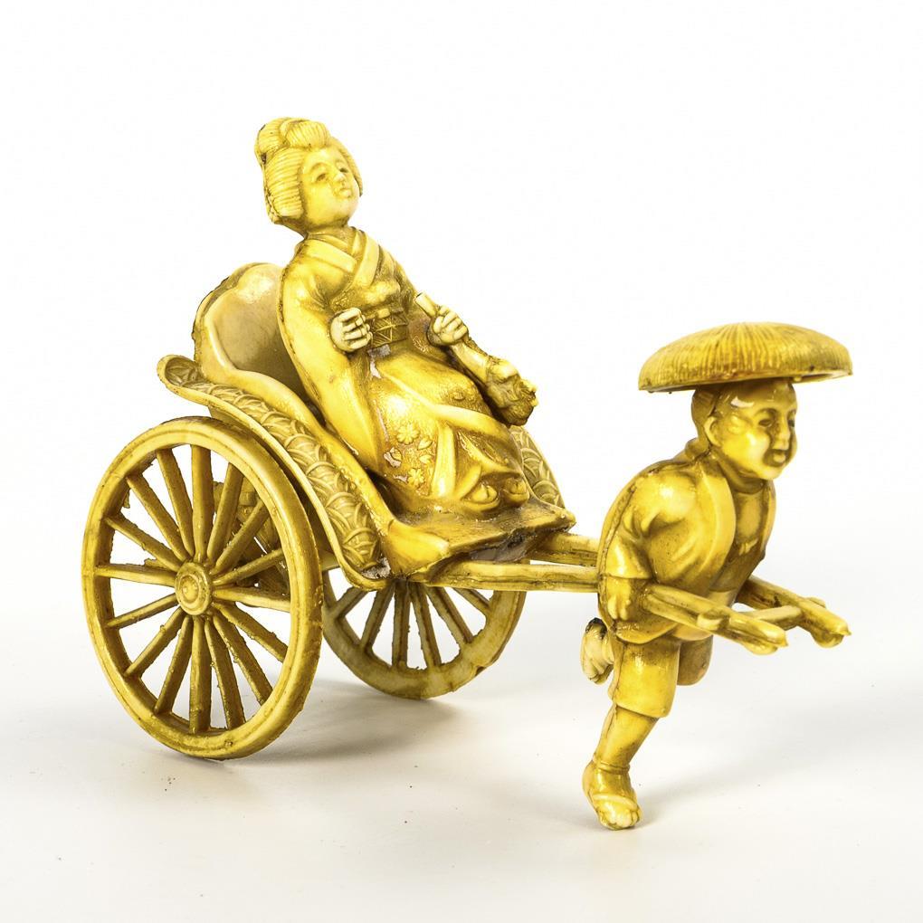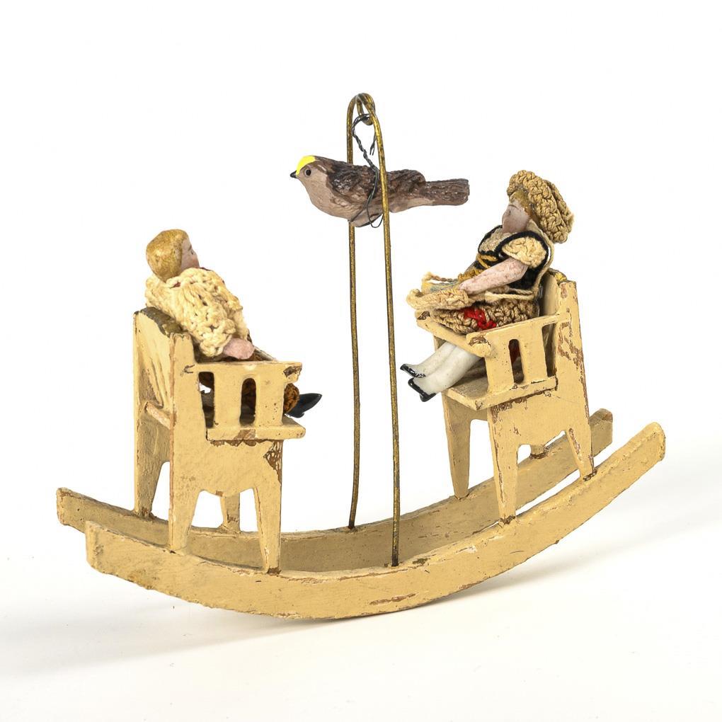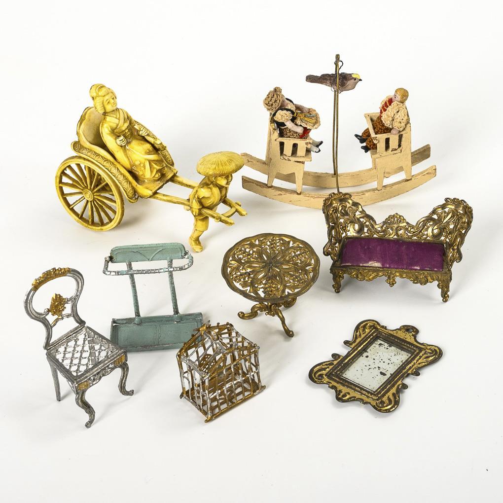 5 Teile aus Zinn: Sofa, Stuhl, Tischchen, Schirmständer und Vogelkäfig. Dazu Spiegel in geprägtem Blechrahmen, Schaukel mit 2 Püppchen und Rikscha aus elfenbeinfarbenem Kunststoff.