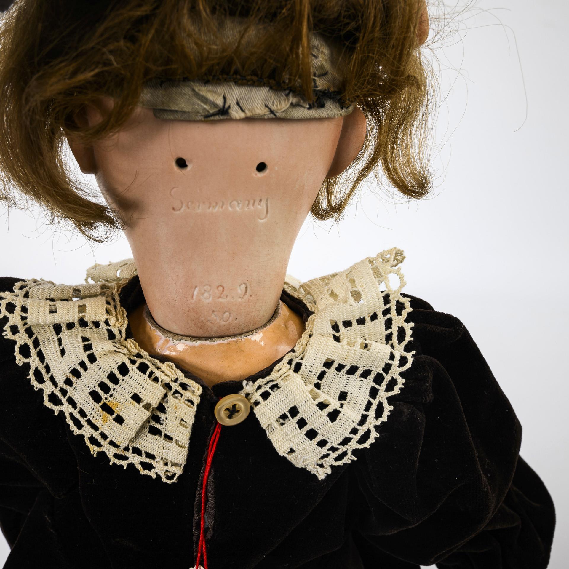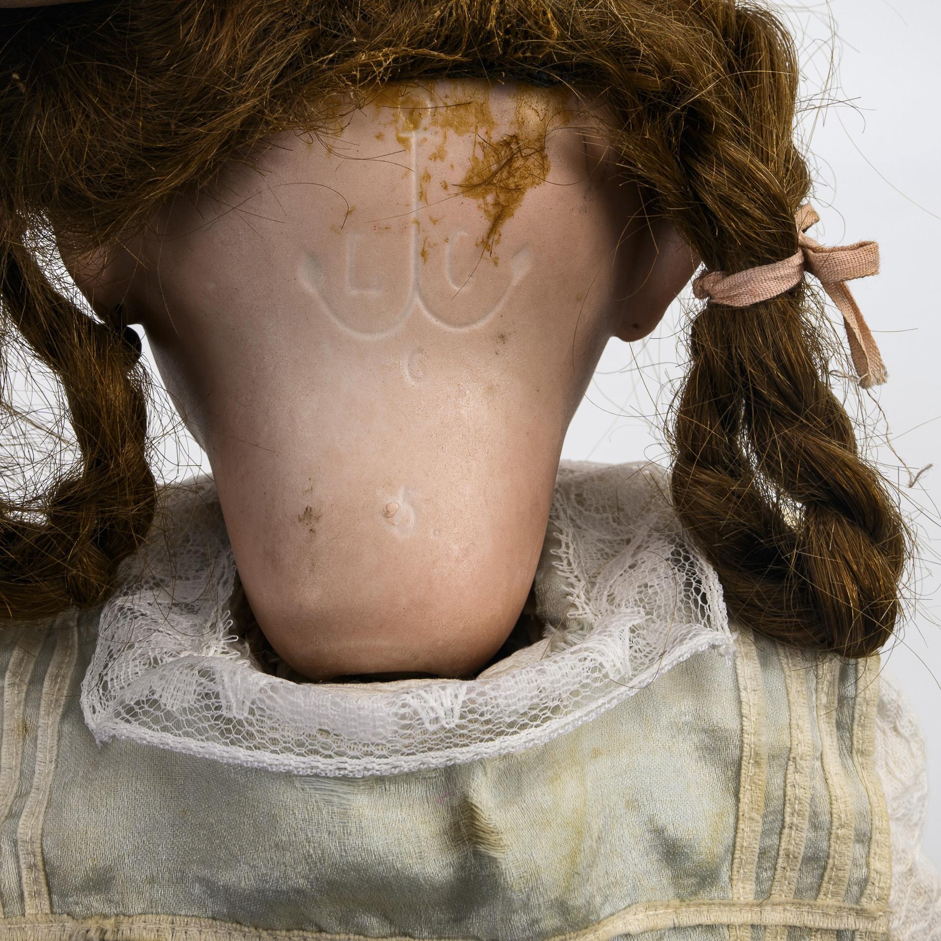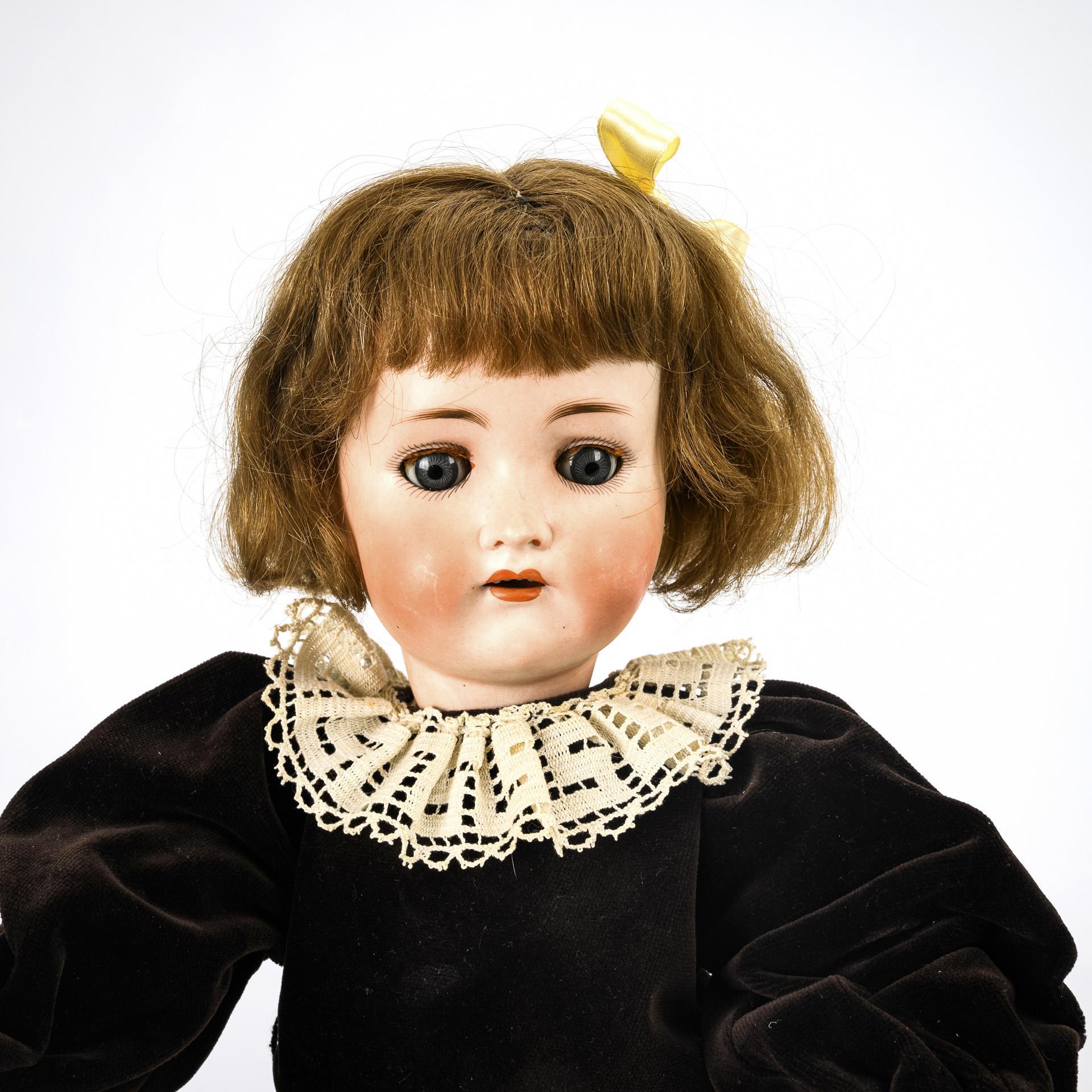 1x Hertel, Schwab & Co (Kopfmarke: Germany 182.0) mit Kurbelkopf, blauen Schlafaugen, Mohairperücke, Gliederkörper und braunem Samtkleid. Kleine Chips an der Halskurbel. / 1x Ankermarke LC mit Kurbelkopf, festen braunen Augen, Ohrlöchern, brauner Echthaarperücke, Körper mit starren Beinen, weißem Matrosenkleid und Haarkranz. Brandriss an einer Kopfnaht, kleine Chips an der Ohrlöchern, 1 Ohrring fehlt.