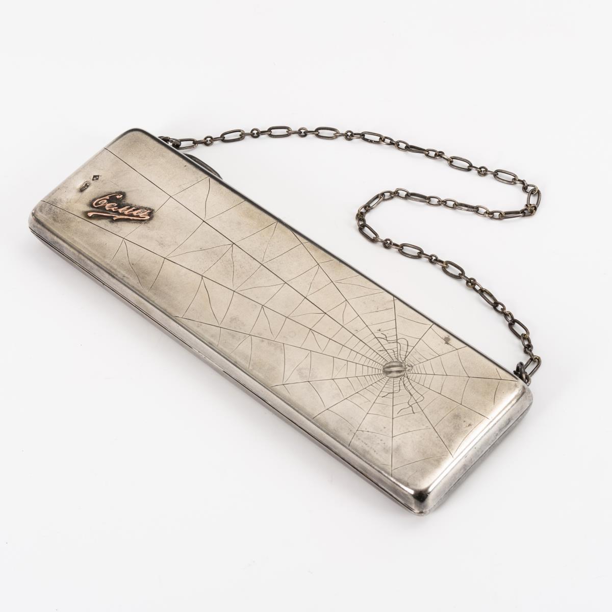 Schmale Abendtasche mit graviertem Spinnennetz, aufgelegtem kyrillischen Namenszug und rotem Ovalcabochon als Verschluss. Leichte Gebrauchsspuren.