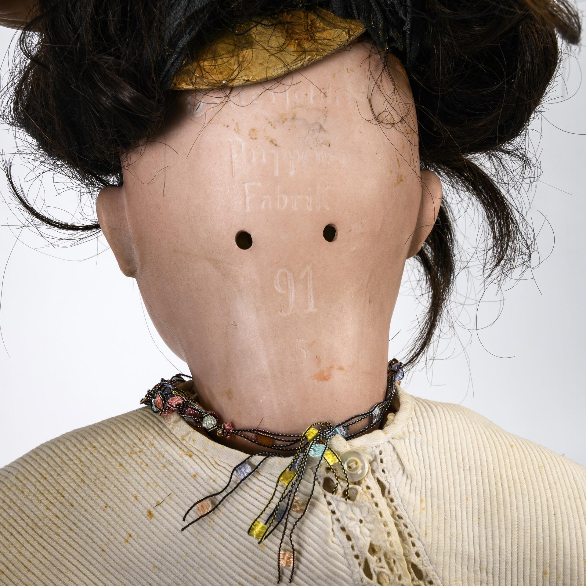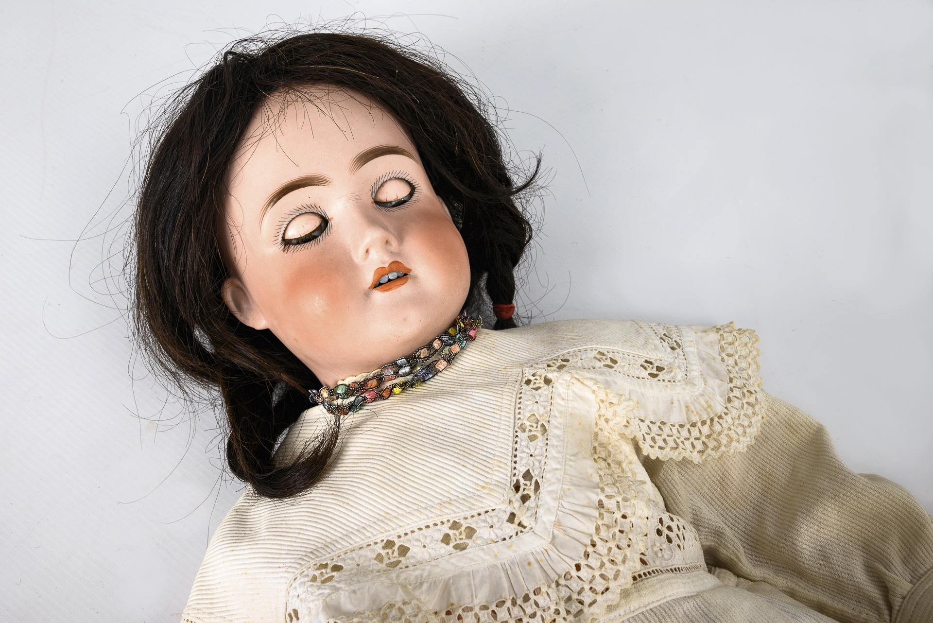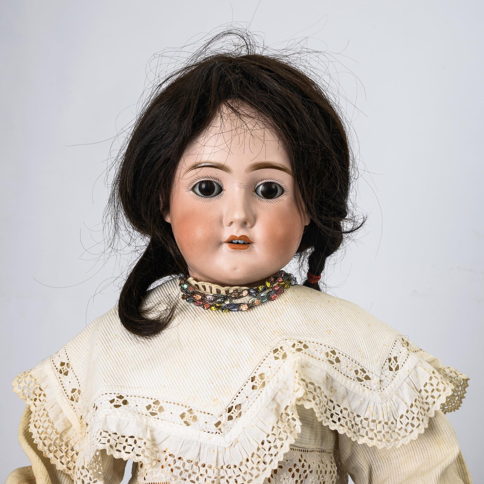 Kurbelkopf, braune Schlafaugen, Echthaarperücke. 15-teiliger Gliederkörper. Weißes Kleid mit Verschmutzungen. Kopf durchleuchtet: ohne Defekte. Linke Hand repariert.