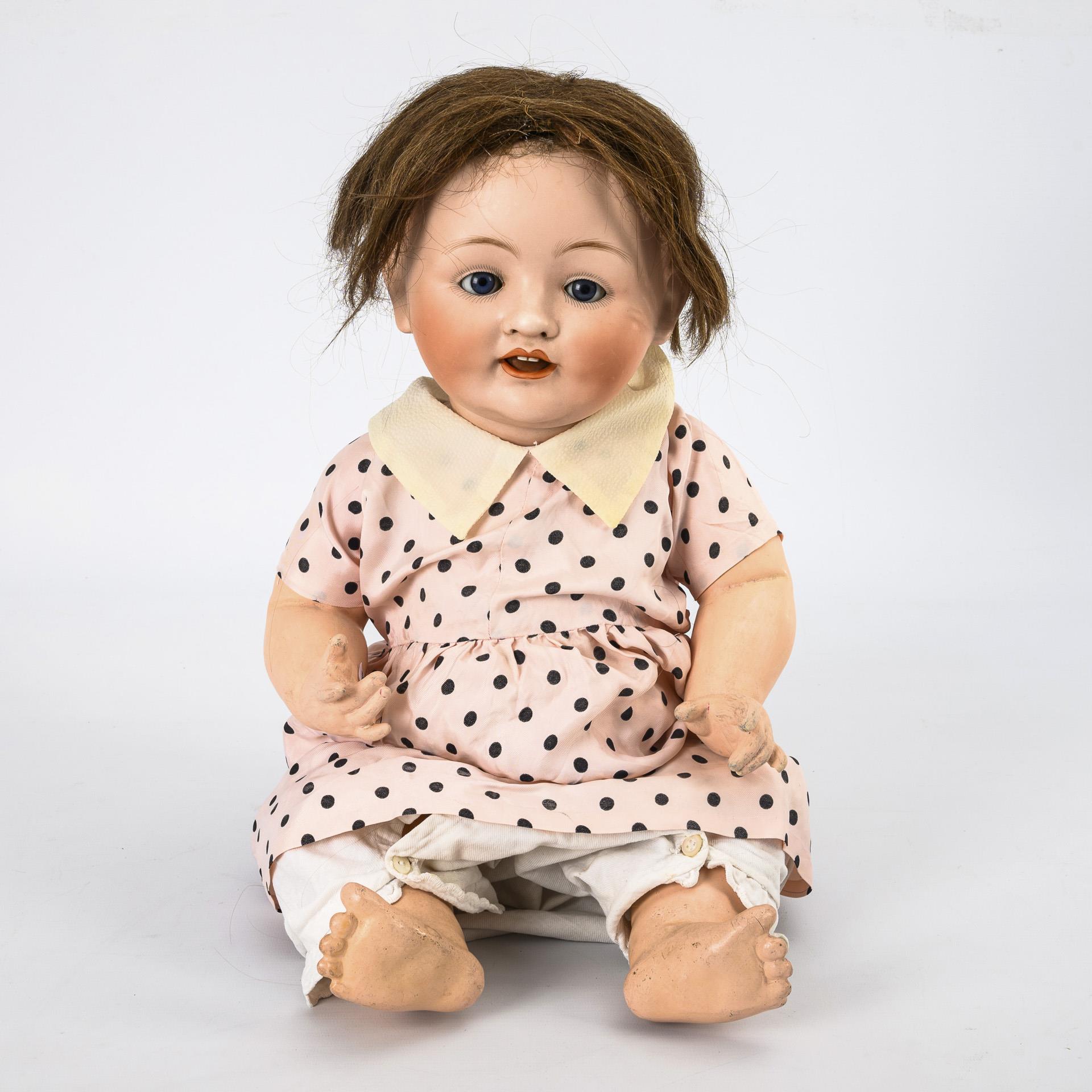 Kurbelkopf, blaue Schlafaugen, offene Nasenlöcher, braune Resthaarperücke. 5-teiliger Sitzbabykörper. Rosa Kleid mit schwarzen Punkten. Kopf durchleuchtet: ohne Defekte. Arme übermalt, 1 Finger links bestoßen.