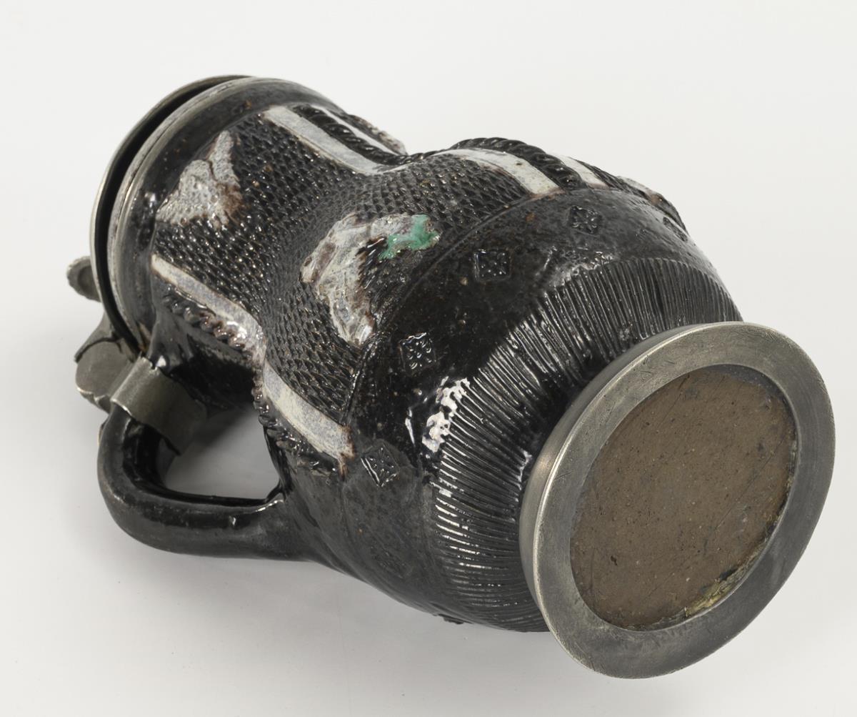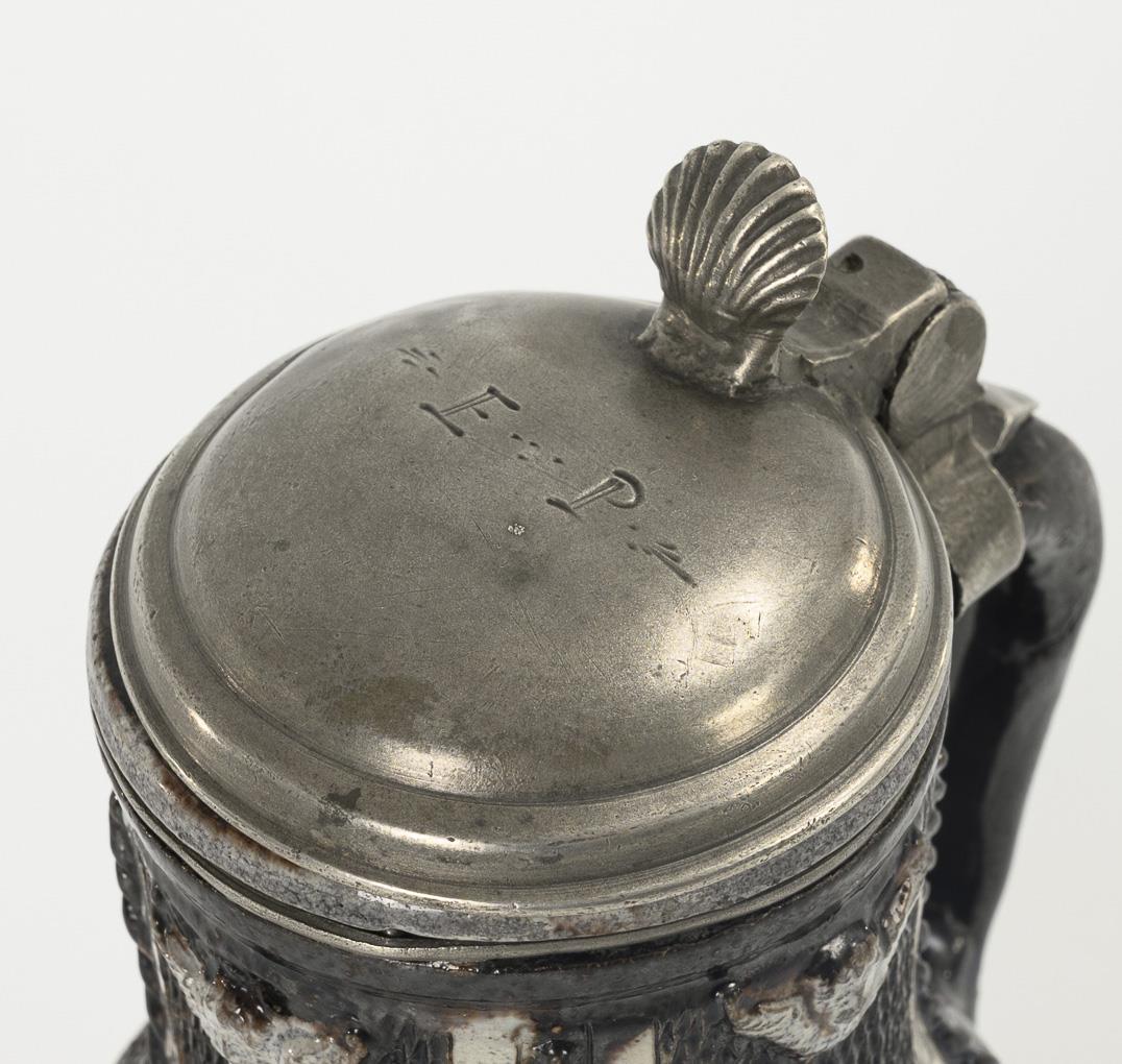 Bauchiger Krug mit Zylinderhals und Bandhenkel. Auf der Wandung ein Netzwerk in 3 Feldern mit Engelsköpfen und springenden Hirschen, getrennt durch vertikale, weiße Bänder und aufgelegte Zopfbänder, im Standbereich eine horizontale Stempelreihe mit Rosetten, Ablauf vertikal schraffiert. Gewölbter Zinndeckel, monogrammiert "E.P.", mit Muscheldrücker und Zinnreifen, Zinnstandring. Zinn mit leichten Defekten.