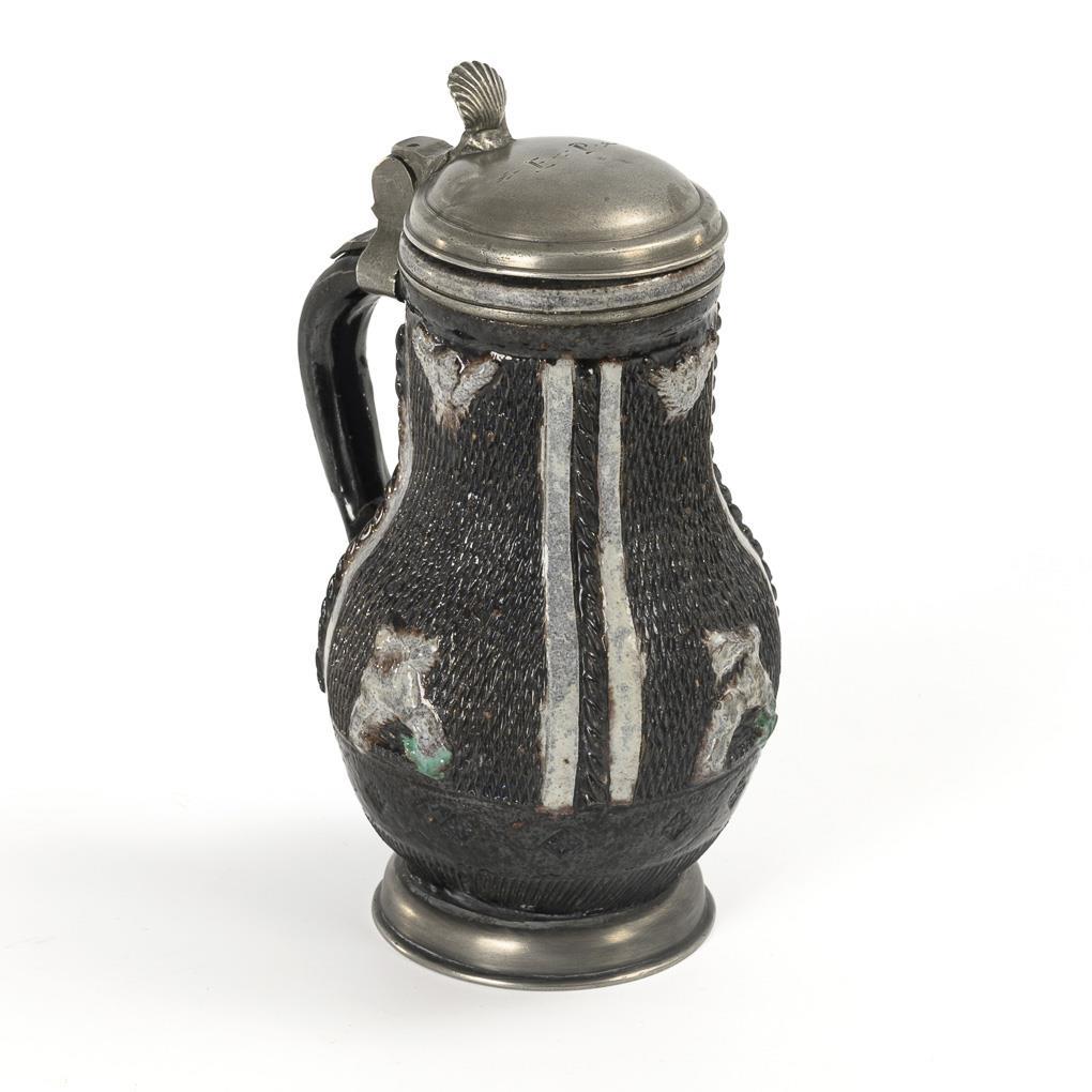 Bauchiger Krug mit Zylinderhals und Bandhenkel. Auf der Wandung ein Netzwerk in 3 Feldern mit Engelsköpfen und springenden Hirschen, getrennt durch vertikale, weiße Bänder und aufgelegte Zopfbänder, im Standbereich eine horizontale Stempelreihe mit Rosetten, Ablauf vertikal schraffiert. Gewölbter Zinndeckel, monogrammiert "E.P.", mit Muscheldrücker und Zinnreifen, Zinnstandring. Zinn mit leichten Defekten.