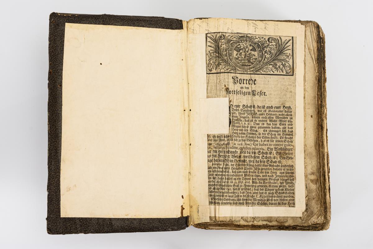 Titelblatt fehlt. Block defekt. / Beigebunden: Quirsfeld, Johann: "... besuchtes Golgatha, oder eine geistliche Wallfahrt an den Ort des bittern Leidens und Sterbens ...", Leipzig 1747, bey Wolffgang Heinrich Schönermarck. 71 Seiten, teils mit Randdefekten. Einband mit Holzdeckel, 35 x 23 cm