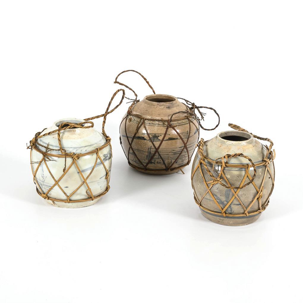 Ein heller und zwei dunkler glasierte Töpfe mit stilisierten Wasserlandschaften. Bastgeflechte in Ordnung. Ein Topf mit zwei herstellungsbedingten Glasurfehlern.