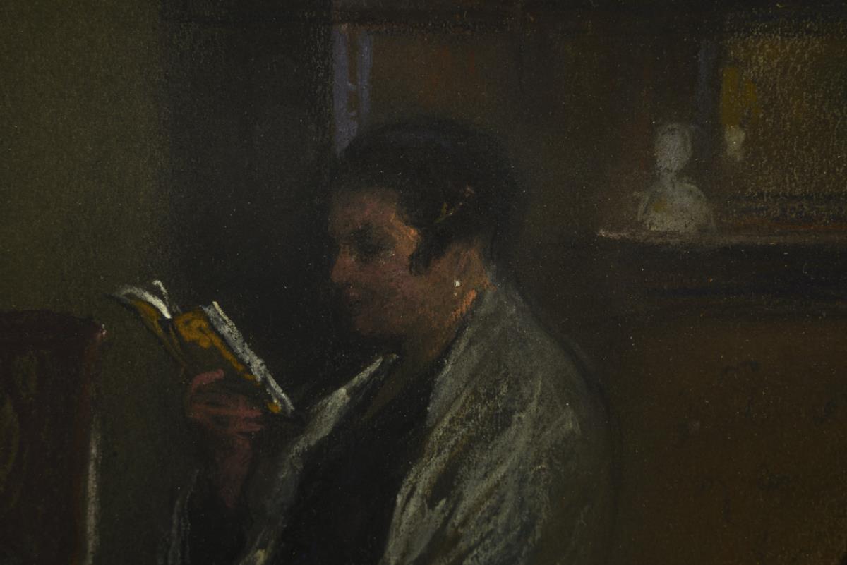 Die lesende Hilda Albrecht im Haus der Familie Albrecht in der Wilhelm-Külz-Str. 22 Weimar, genauer im Untergeschoß mit Fenster zum Garten. Vgl. Weber, Christiane: Villen in Weimar, Bd. 5, Erfurt 2005, S. 7ff. Publikation anbei.