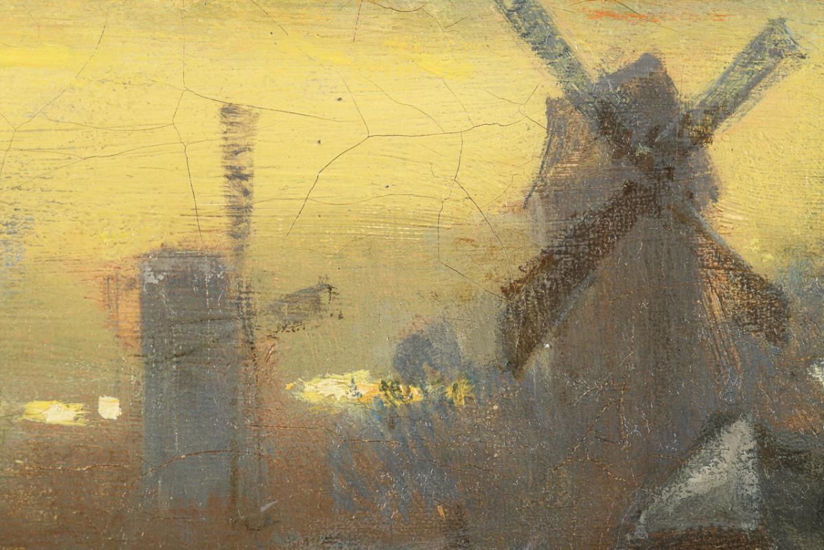Abendstimmung mit vielen Personen auf dem gefrorenen Fluss nahe der Stadt mit Windmühlen. Leinwand doubliert.