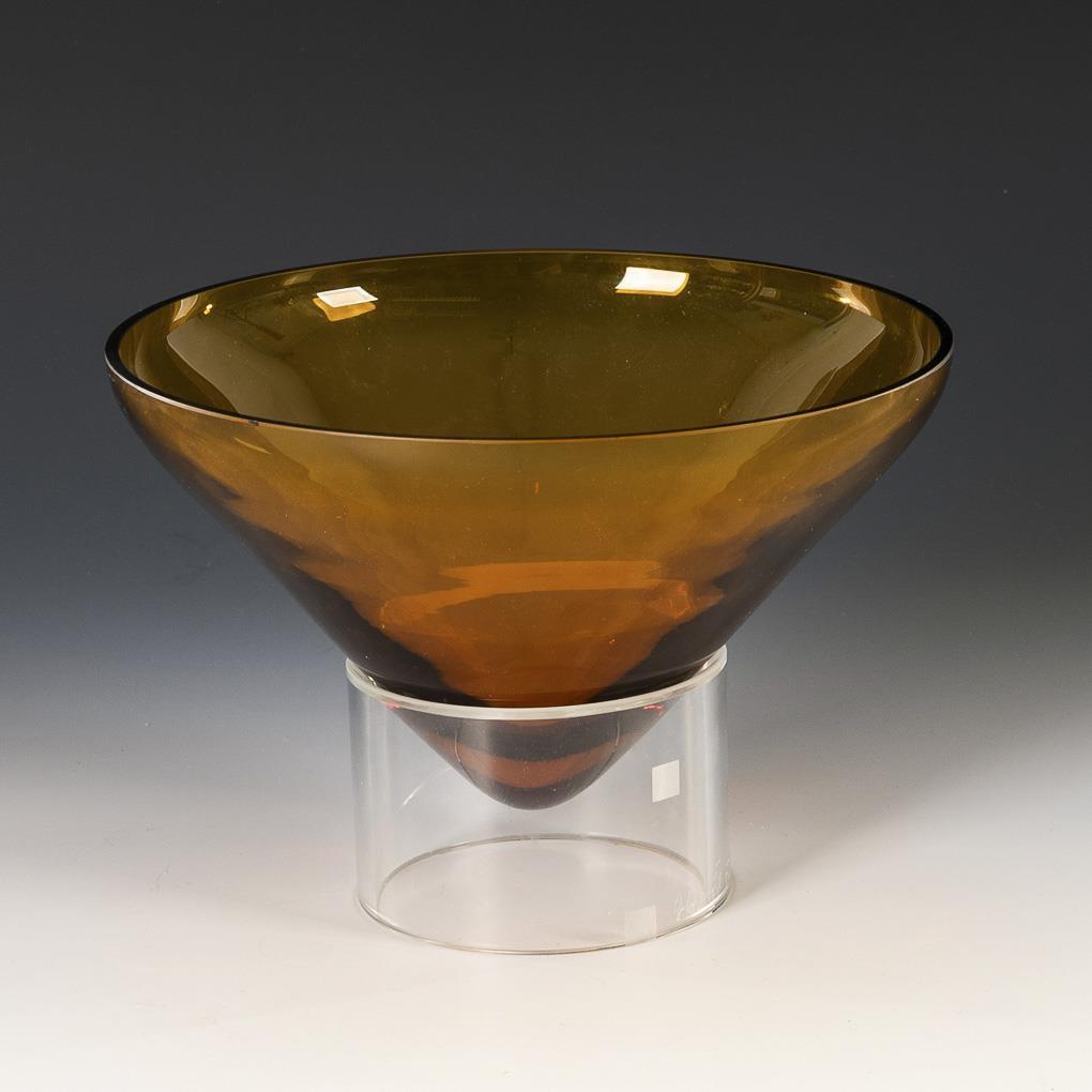 Konische Schale aus bernsteinfarbenem Glas, aufgelegt auf einen Ring aus farblosem Glas.