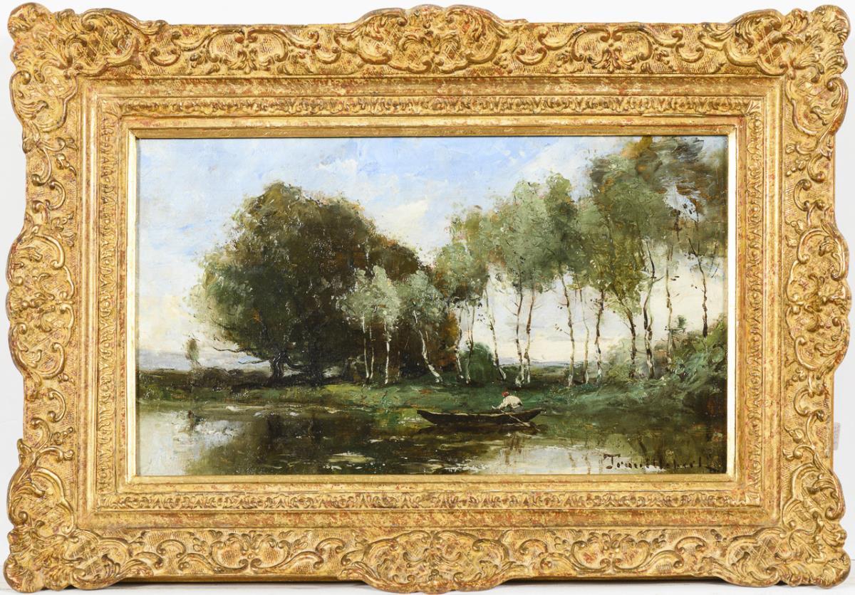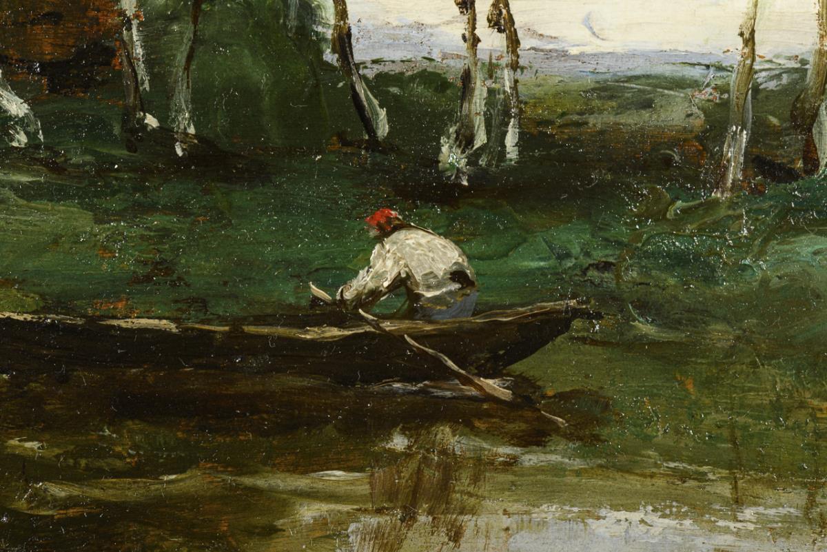 Impressionistisch gemalter Flusslauf mit schlanken Birken und Kahnfahrer unter bewölktem Himmel. Leichte Altersspuren.