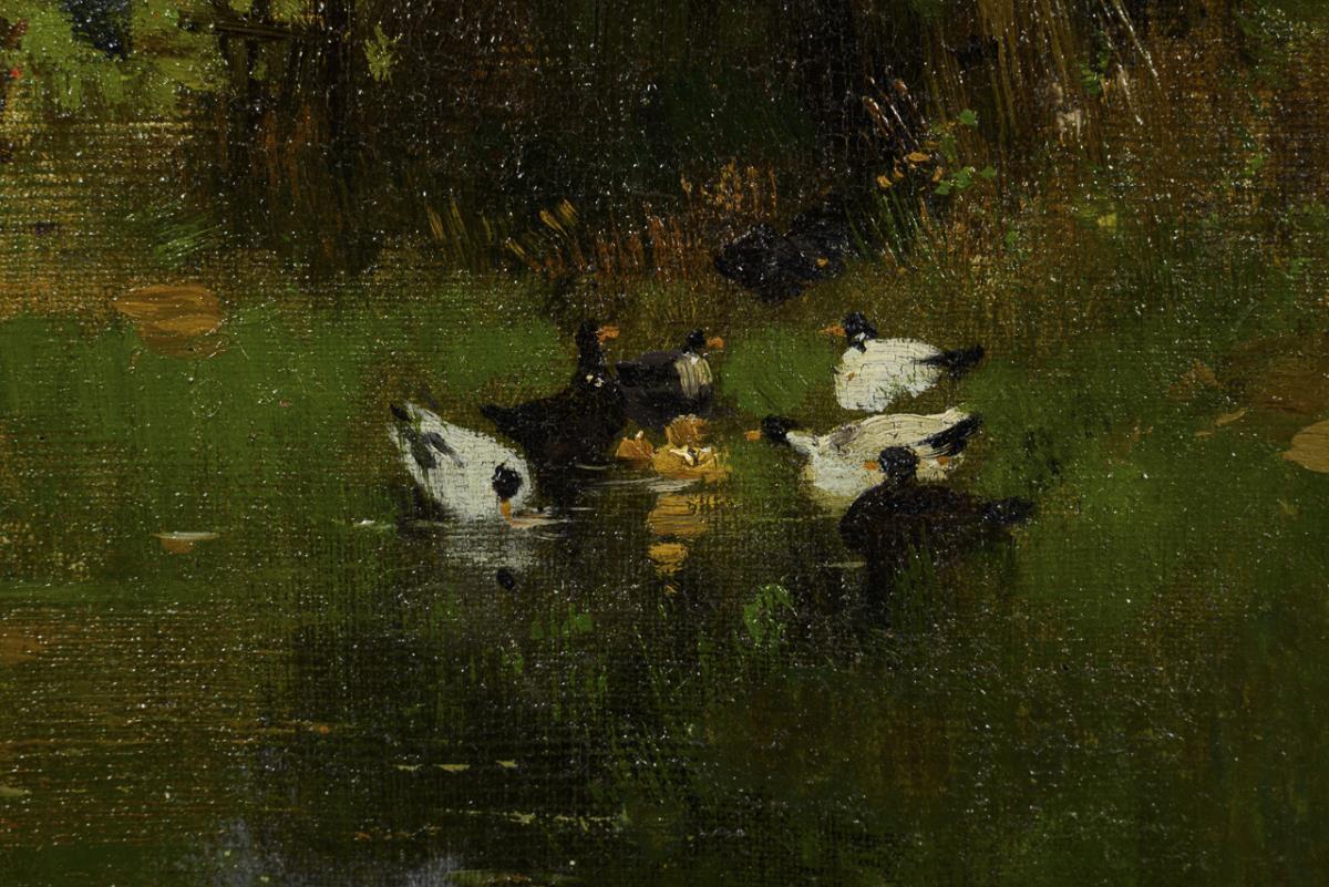 Enten auf dem Teich vor einem Gehöft und der Kirche an einem sonnigen Tag. Im Himmel retuschiert.