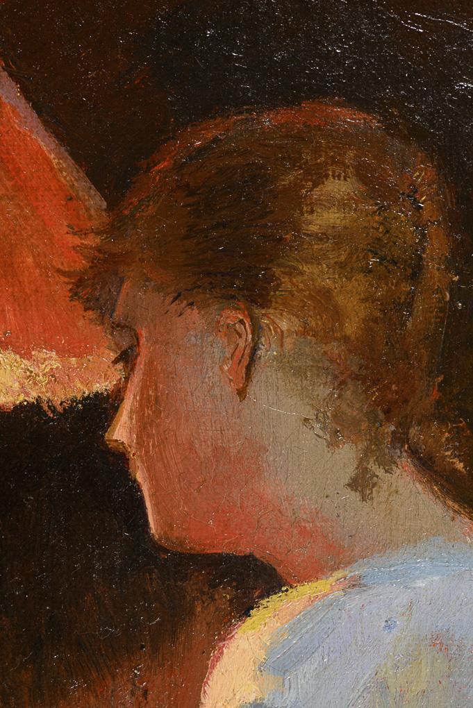 Junge Frau beim Lesen im Schein der Lampe. Zwei kleine restaurierte Stellen mit Hinterklebungen.