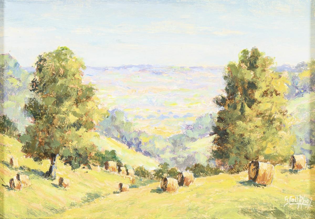 Blick vom Berg in die weite sonnige Landschaft mit den vielen Heuballen.