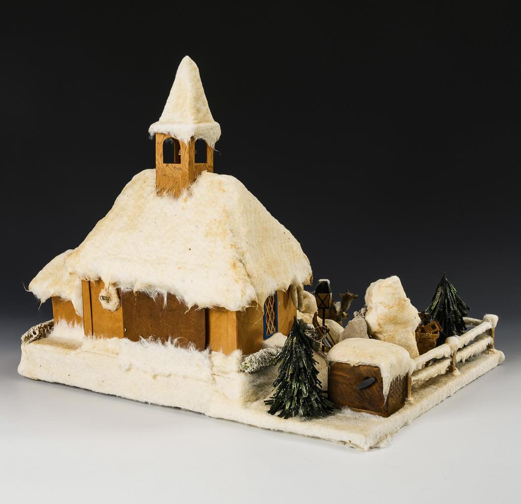 Winterlandschaft mit beleuchteter Kirche und Spieluhr.