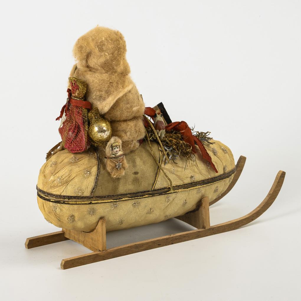 Watte-Weihnachtsmann mit Oblatengesicht, auf spitzovaler Candybox mit Holzkufen sitzend. Mit Schriftzug "Fröhliche Weihnachten" aus Goldpappe. Altersspuren, kleine Defekte.