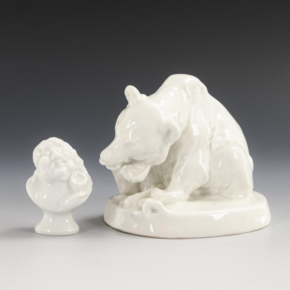 1x sitzender Bär, Modell-Nr. A 1059, Entwurf 1922 von August Gaul (1869-1921). / 1x Doppelbüste Bacchus und Bacchantin (H 5 cm). 2 kleine Brandrisse im Nacken des Bären.