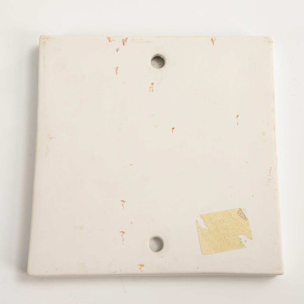 Weiß mit minimaler, unterglasurblauer Staffage. 14,5 x 14,5 cm.