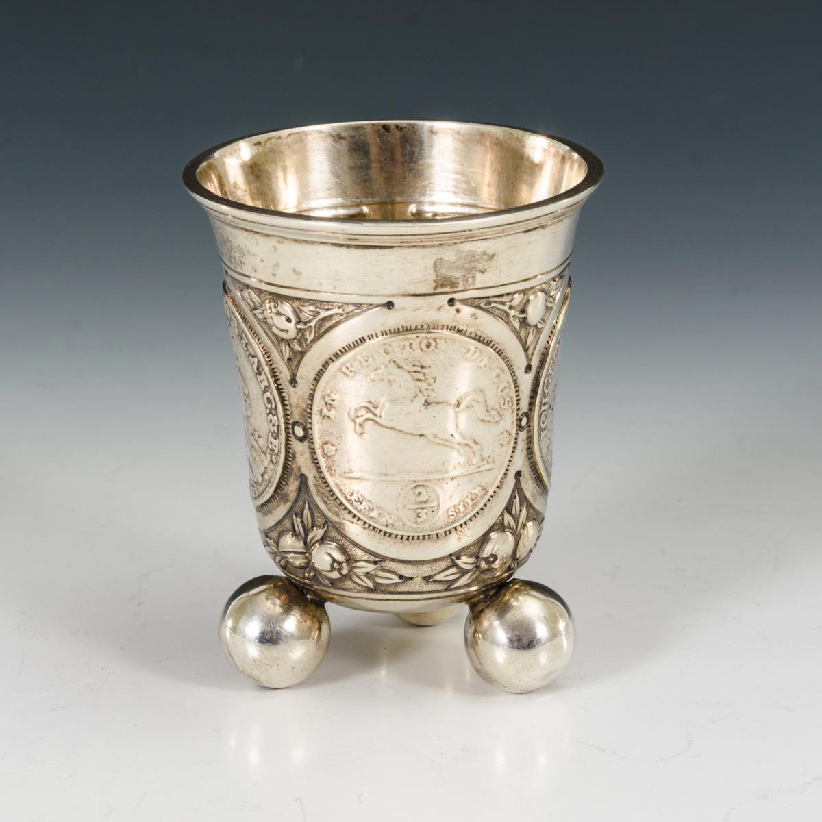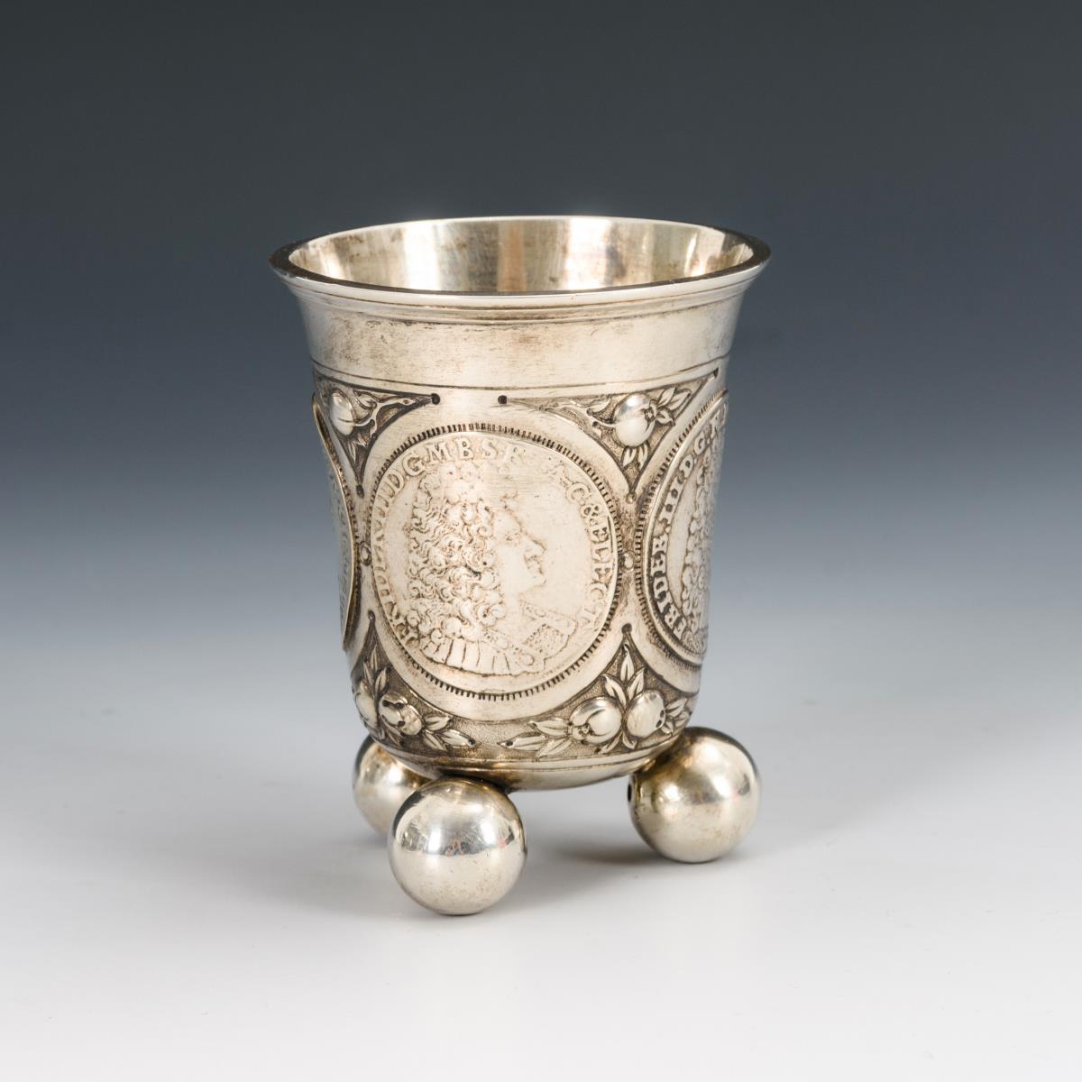 Kleiner Münzbecher mit 4 eingelegten, wohl historischen Münzen. Auf 3 Kugelfüßen. Füße minimal gedellt.