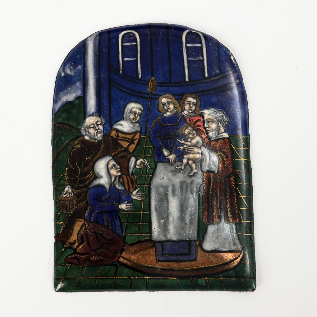 Emailminiatur mit leicht gedrücktem Rundbogenabschluss im ergänzten Rahmen. In einem Tempel mit Ausblick in die Landschaft gestellte Figurenszene: Maria kniet vor dem Altar, während Joseph eine Kerze hält. Der Prophet Simeon hält über dem Altar das nackte Jesuskind mit Strahlennimbus, das sich zu ihm umdreht. Im Hintergrund weitere Personen, darunter Hannah. Die Darstellung ist getragen von dem Kreis der unterschiedlich bewegten Figuren sowie dem starken Kontrast des grünen Bodens zur intensiv blauen Tempelwand. Platte in sehr gutem Zustand, ergänzter Rahmen geklebt und überbronziert.