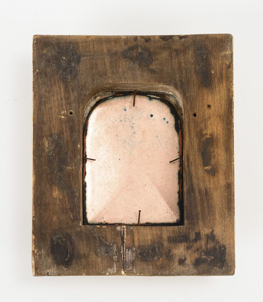 Polychromes Maleremail, goldgehöht, auf leicht bombierter Kupfertafel, farbloses Konteremail, vergoldeter Holzrahmen. 8,5 x 6,0 cm, Rahmen 15 x 12,5 cm.