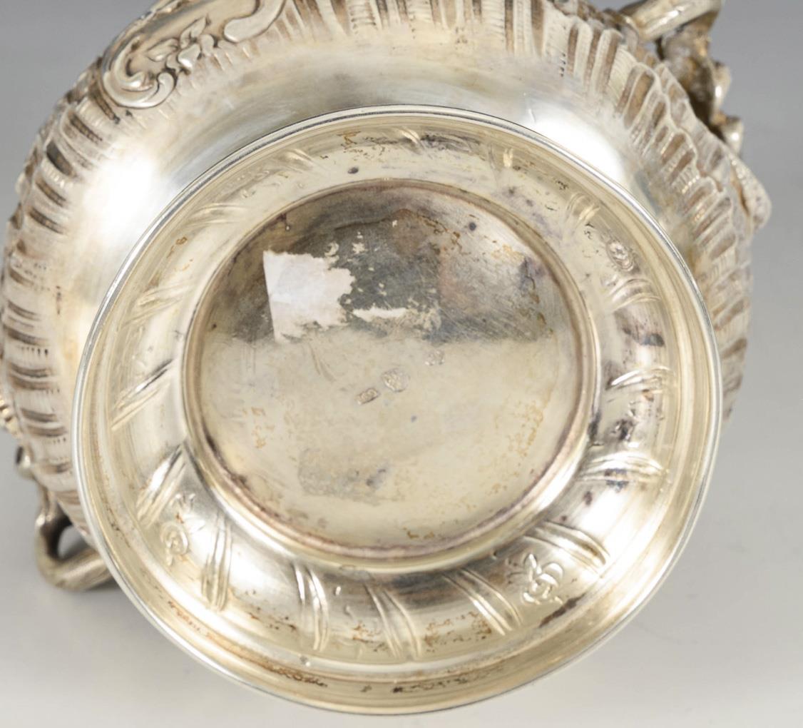 Runde, godronierte Dose mit 2 Henkeln, Rocaillenrelief und Steckdeckel. Gebrauchsspuren.