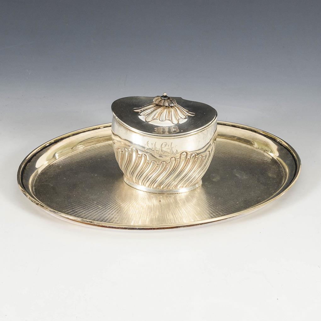 Fein guillochiertes Tablett mit gravierter Wappenkartusche mit Helm und Lorbeerkranz (13 Lot gepunzt). 27 x 20,5 cm, 279 g. / Ovale Zuckerdose im Queen-Anne-Style mit Monogrammgravur "ABA", innen vergoldet (London 1895 gepunzt). 10 x 9,5 x 8,5 cm, 117 g. Dose mit defektem Deckelknauf.
