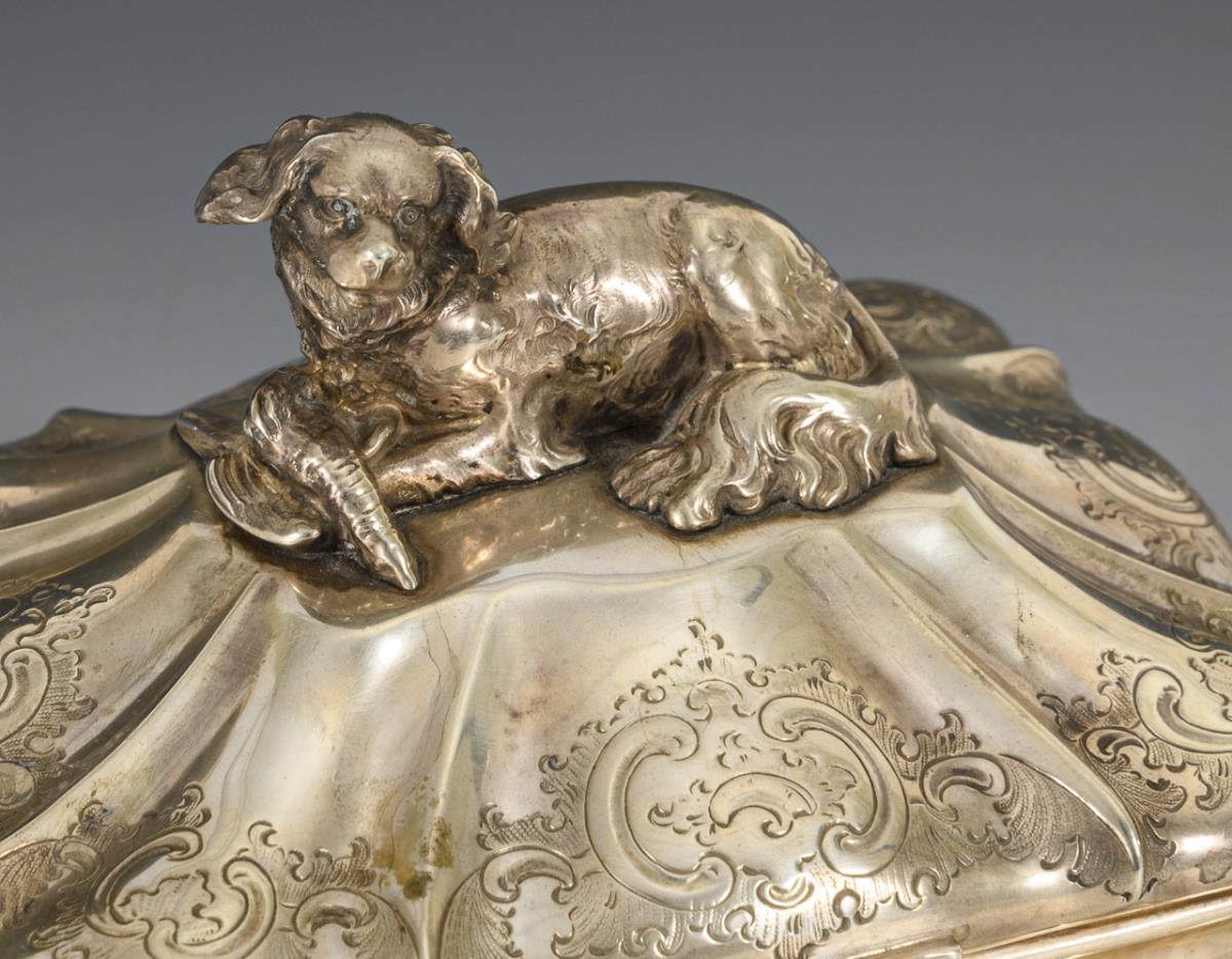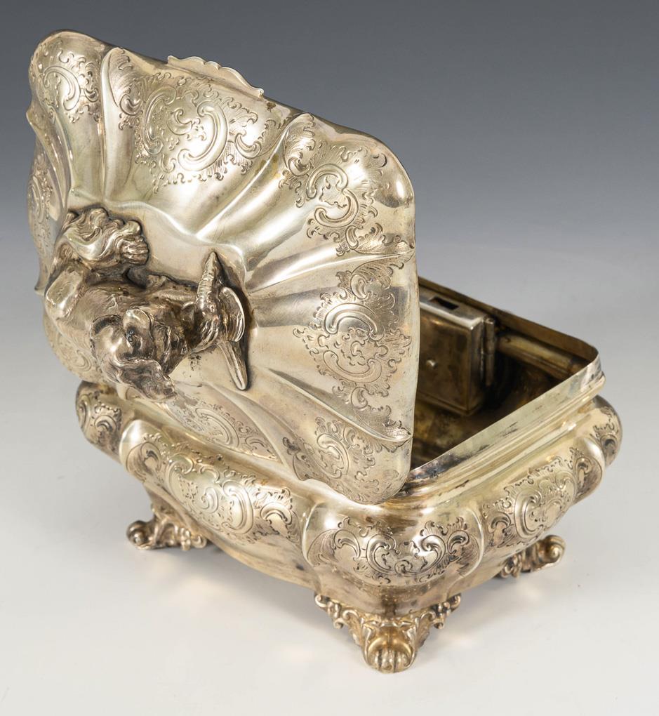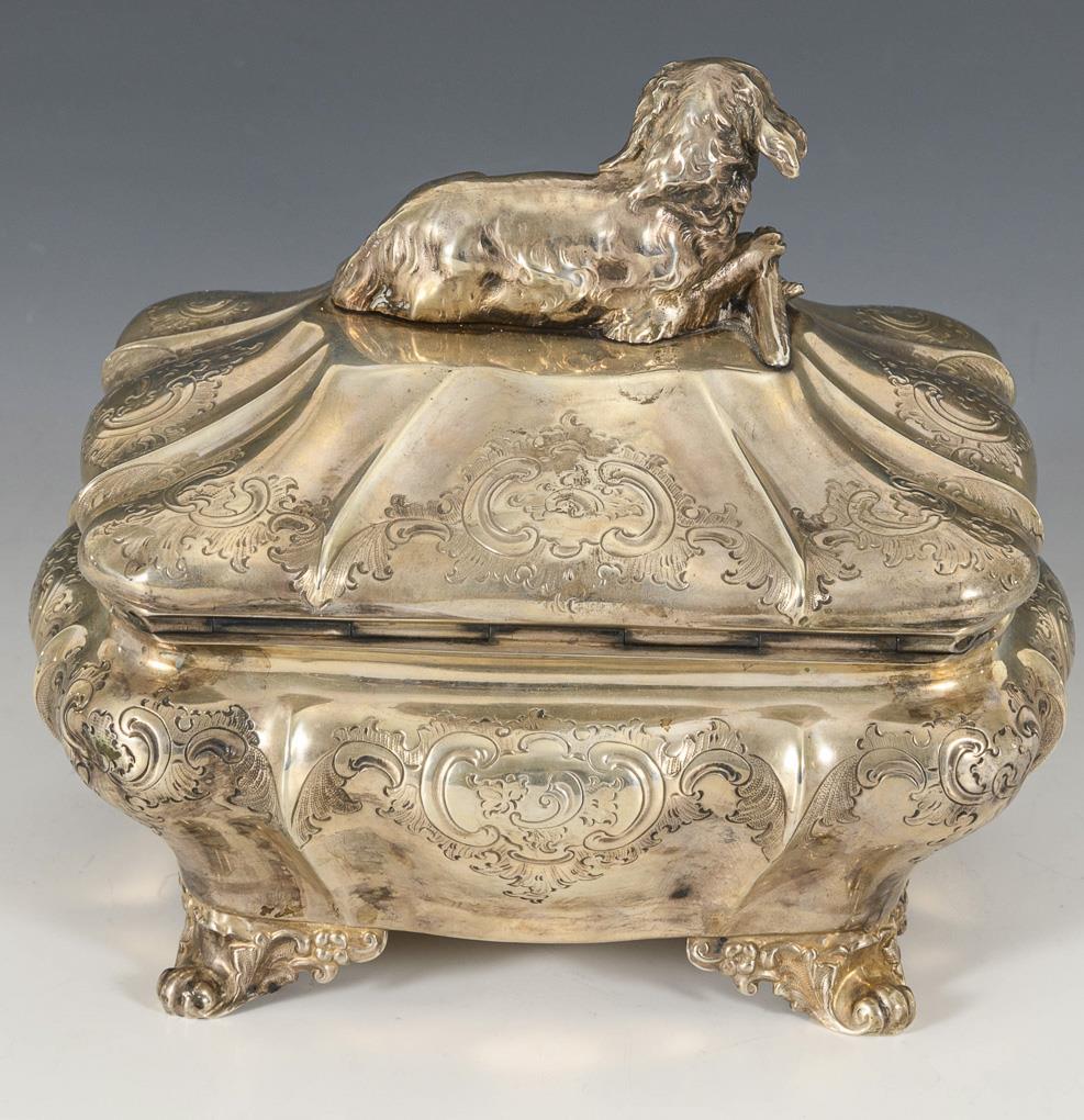 Verschließbare Spätbiedermeier-Dose mit gebauchtem Korpus, Rocaillenzier und liegendem Hund als Deckelknauf. 1 Schlüssel.
