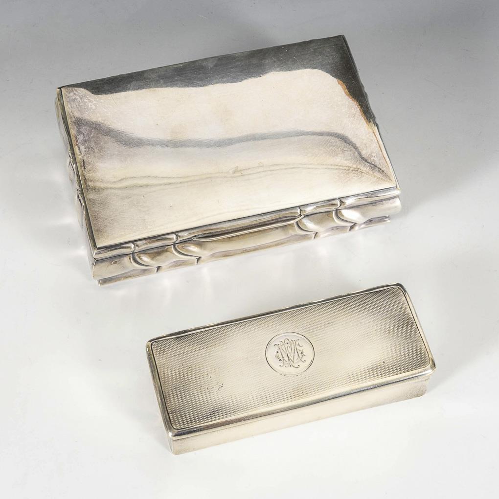Rechteckige, godronierte Silberdose mit glattem Scharnierdeckel und Holzauskleidung innen. 800/Firmenzeichen Hermann Bauer, Schwäbisch Gmünd gepunzt. 4,5 x 14,5 x 9,5 cm. / Schmale, englische Tabatiere mit guillochiertem Scharnierdeckel und Monogrammgravur "PMC". Levi & Salaman, Birmingham 1912 gepunzt. 2,5 x 11,5 x 4,5 cm. 94 g. Gebrauchsspuren, Dellen.