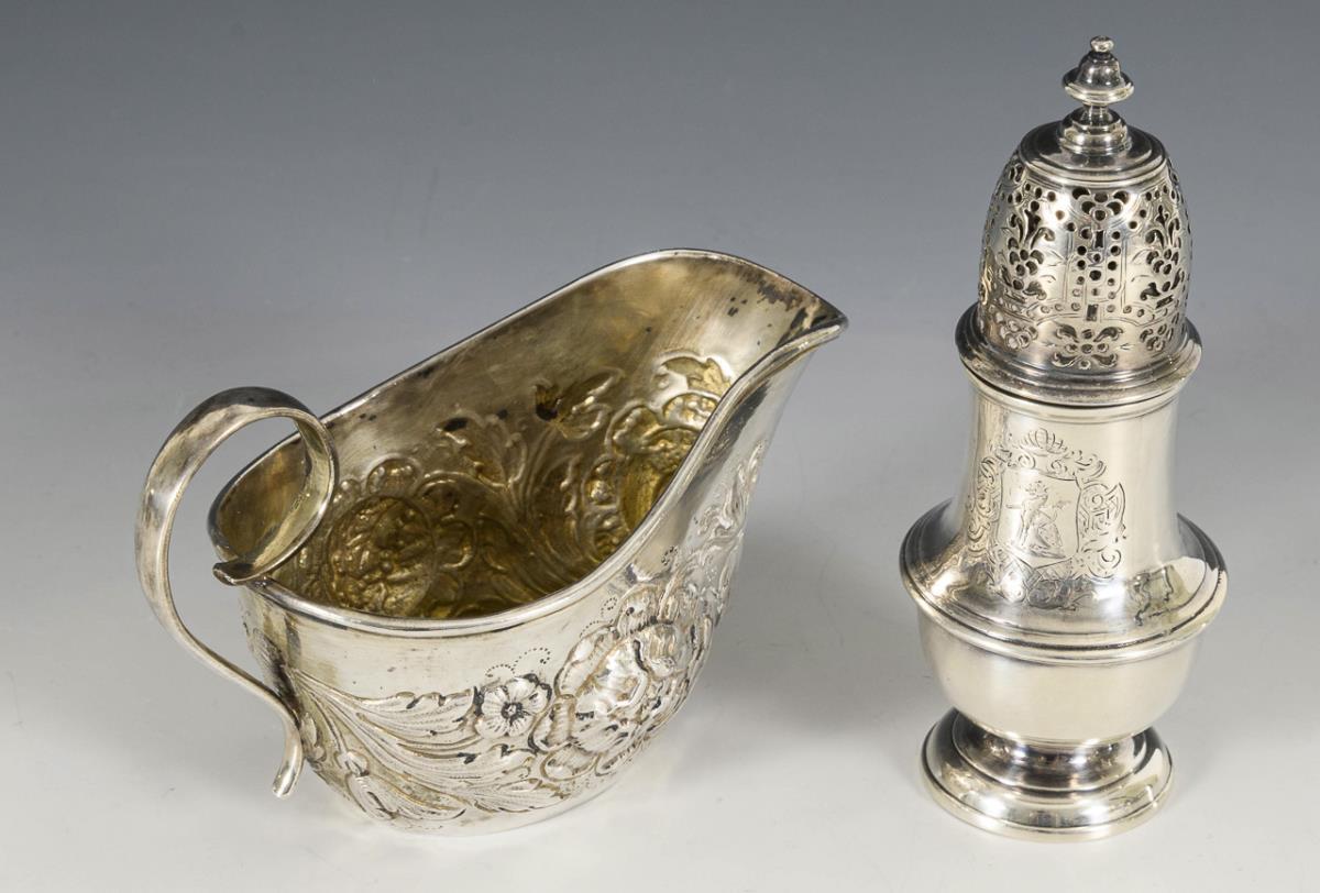 3 Teile: Englischer Streuer mit graviertem Adelswappen (London 1728). H 13,5 cm, 134 g. / Reich reliefierte Sauciere bzw. Gießer mit Blütendekor. Undeutlich gepunzt. 8,5 x 13 x 7 cm, 117 g. / Ovale Zuckerschale im englischen Stil mit Kordelkante. Undeutlich gepunzt. 6 x 13 x 9,5 cm, 168 g. Gebrauchsspuren, teils gedellt. Streuer mit unterseitigen Lötspuren.
