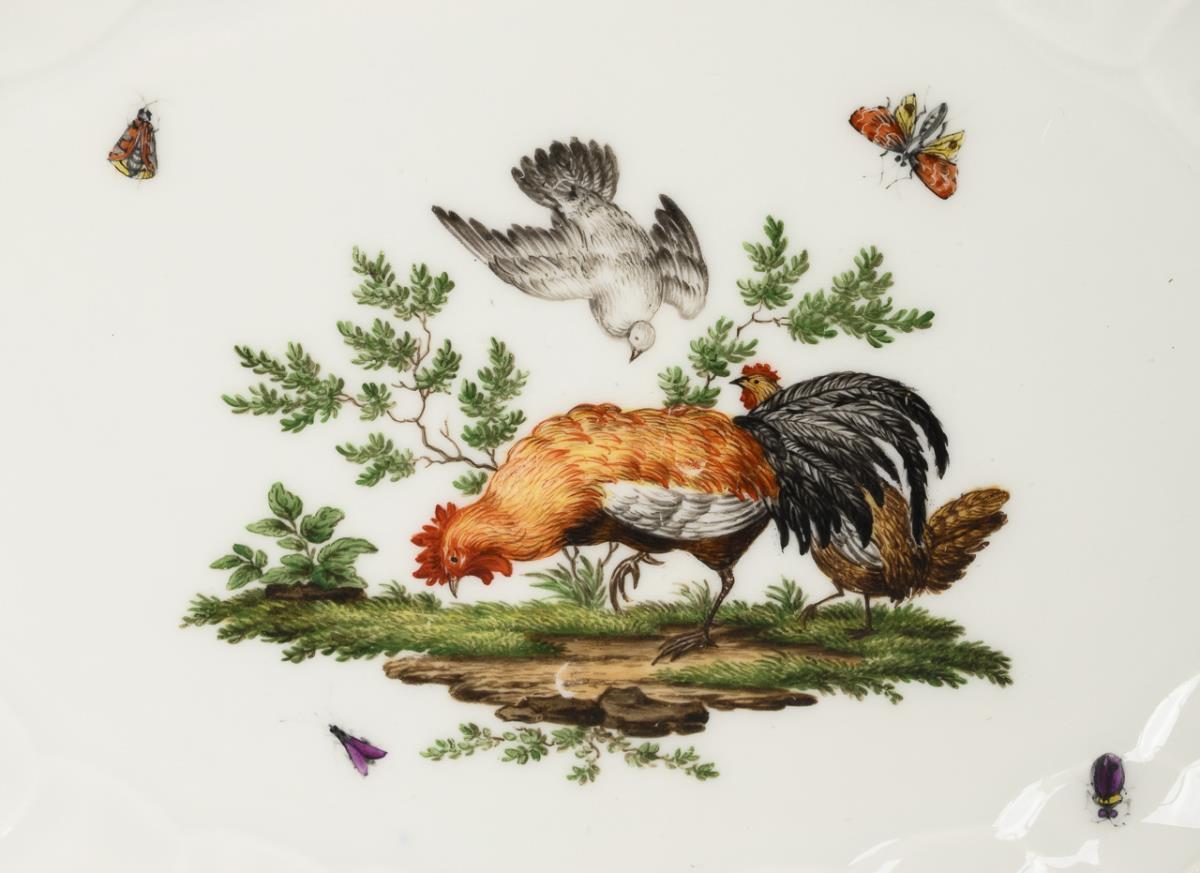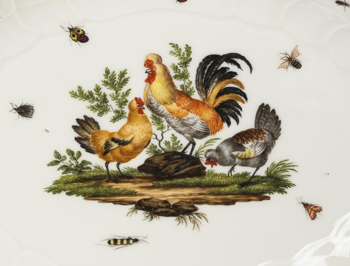 Form "Neubrandenstein". Ovale Schalen mit der Darstellung von Hahn und Hühnern im Spiegel. Gold berieben, 1x restaurierte Haarrissspinne an der Fahne.