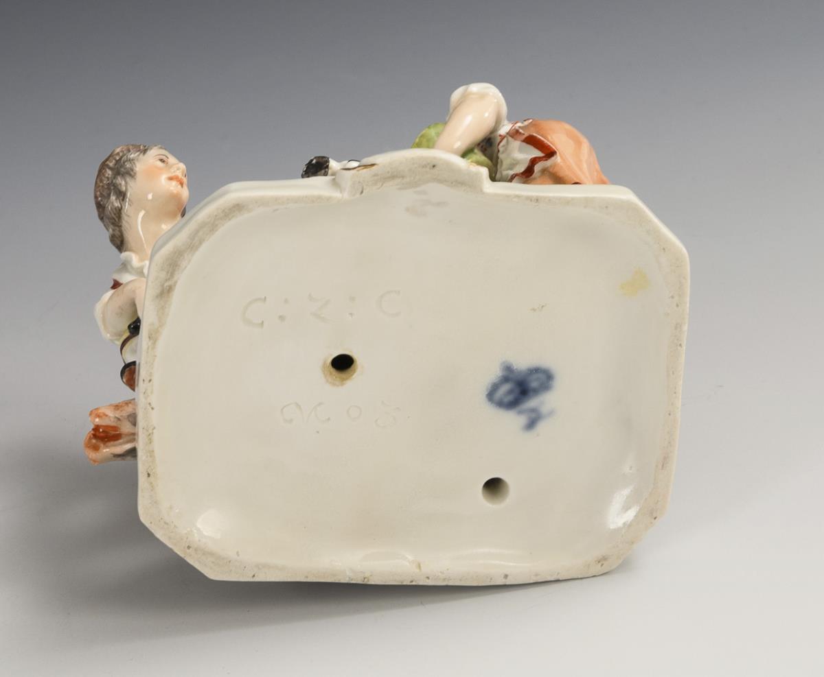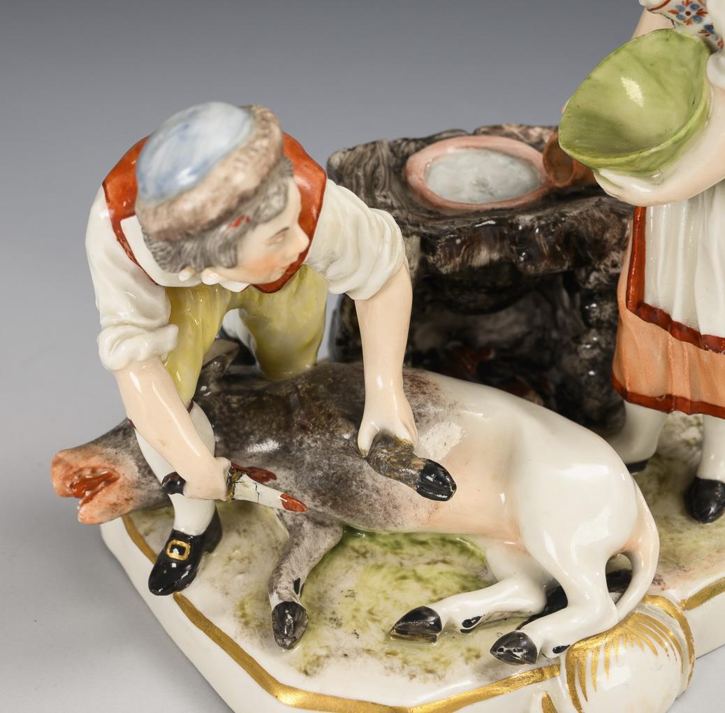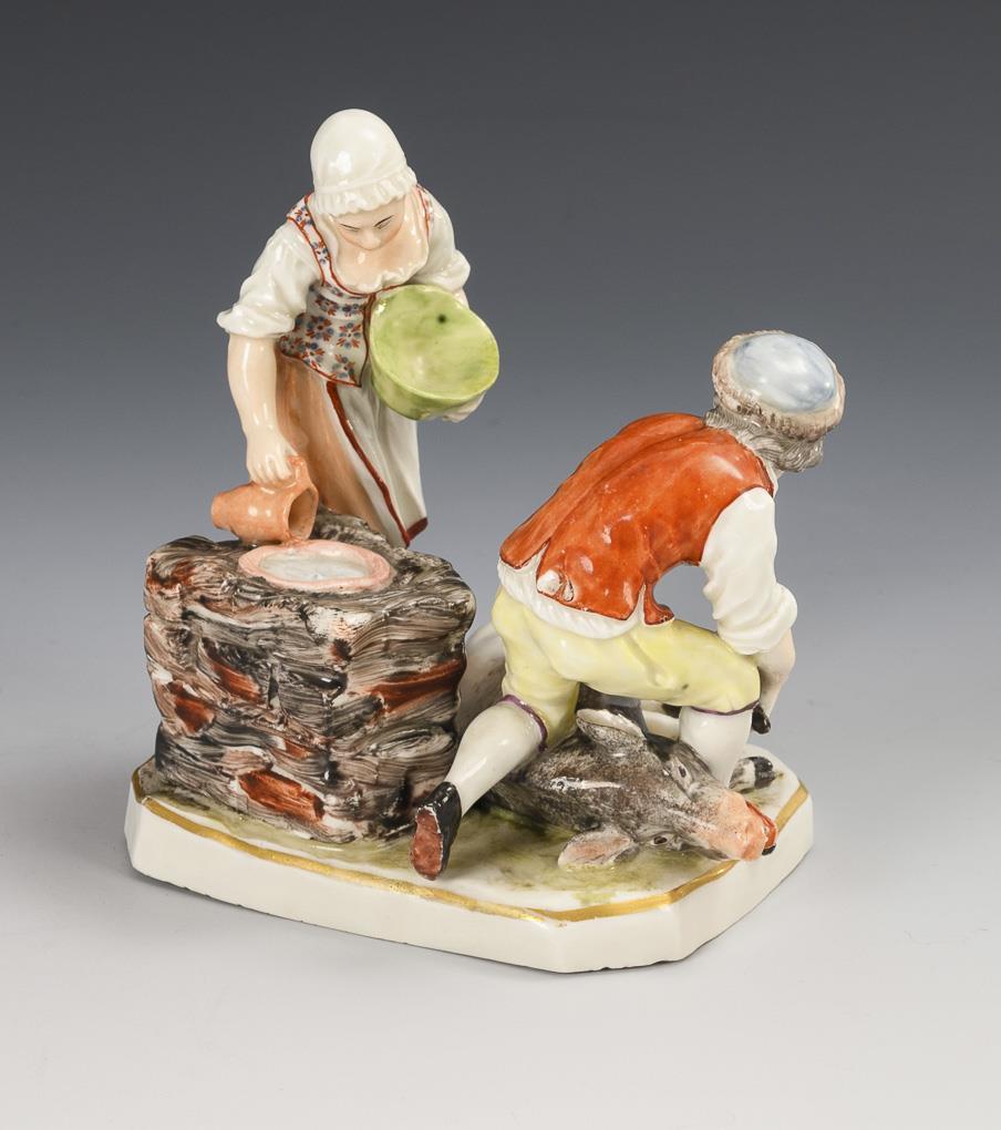 Fleischerpaar, ein Schwein schlachtend. Sockel und linkes Vorderbein des Schweins restauriert, Messer des Metzgers geklebt.