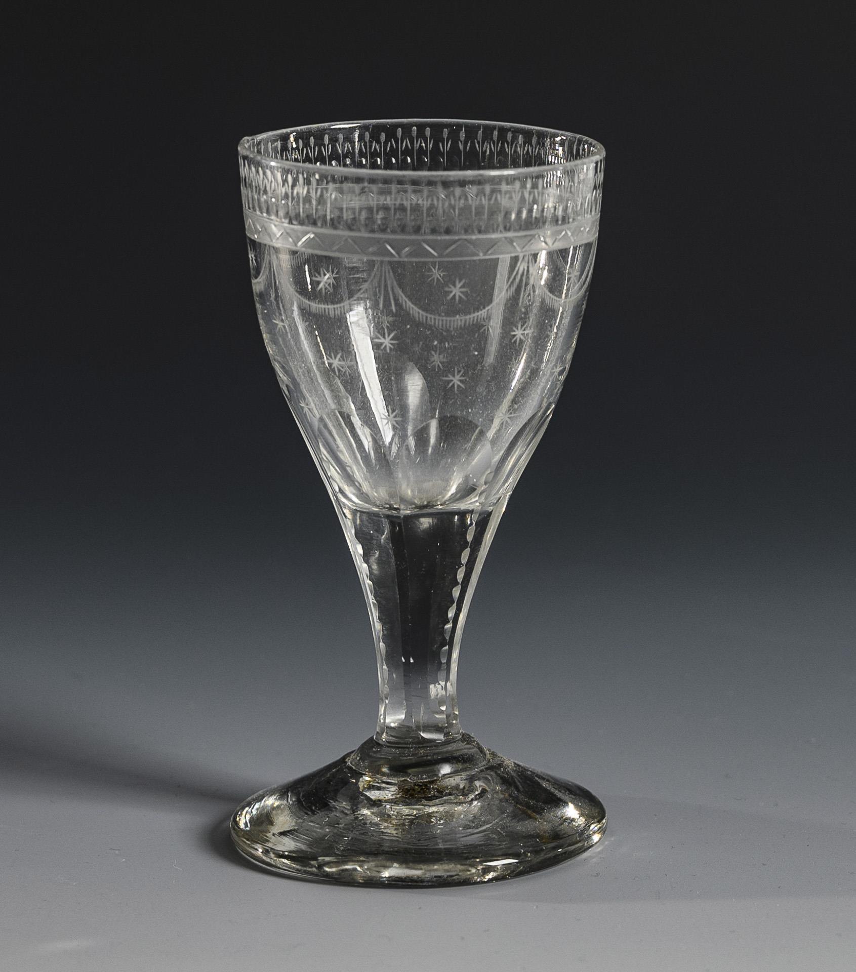 Enghalskaraffe mit facettiertem Hals, Kerb- und Sternchenschliff sowie originalem Stopfen (H 29,5 cm). / 6 Gläser mit halbovoider, in den facettierten Schaft übergehender Kuppa, Sternchenschliff und einer Stecknadelblumenbordüre (H ca. 11,5 cm).