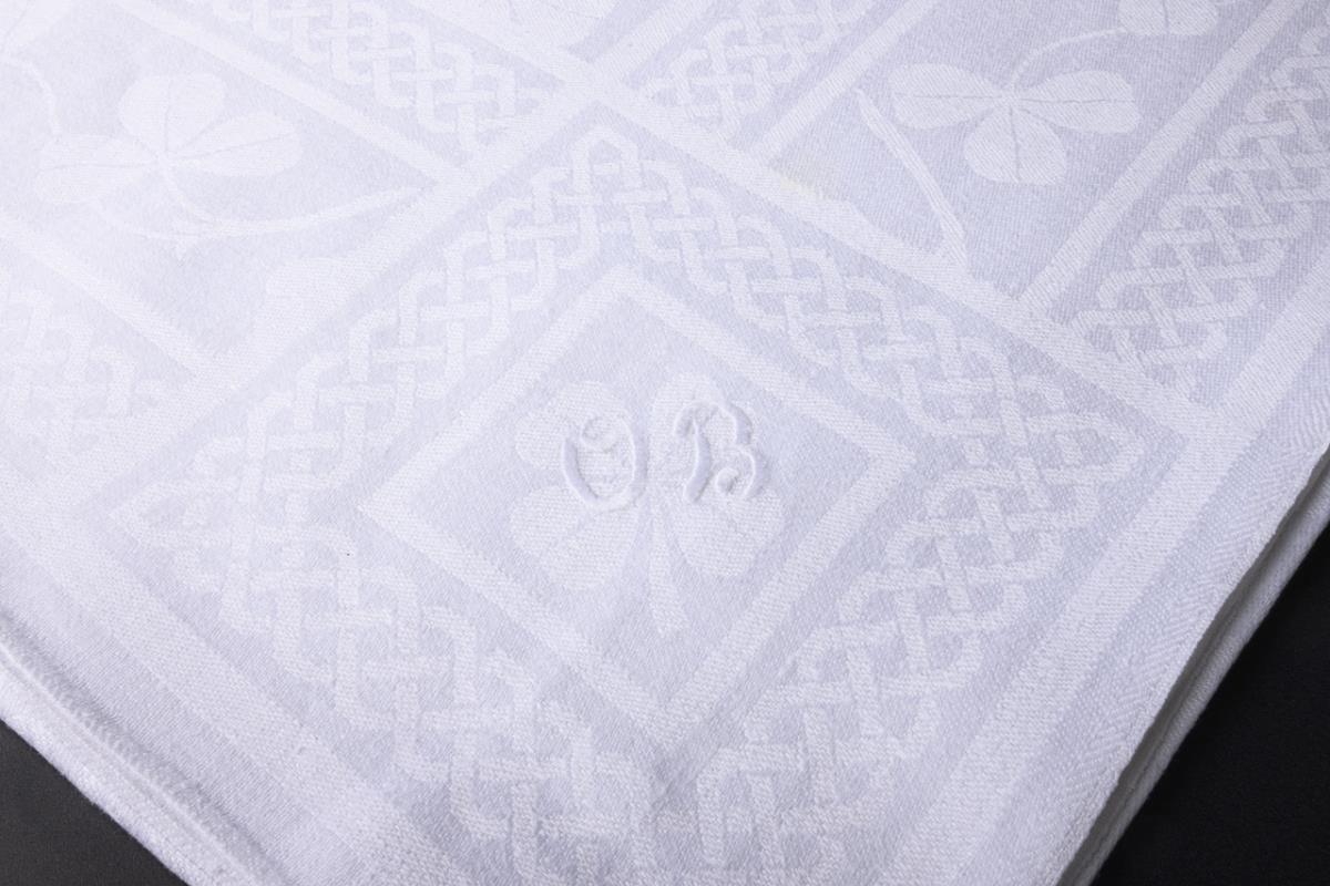 Quadratische Tücher mit verschiedenen Dekoren u.a. Kleeblätter, florale Rocaillen und Blumenmotive, Sonnenblumen, Dahlienzweige, Rosenzweige mit Schleifenbändern. Gestickte Monogramme OB/D/SM.