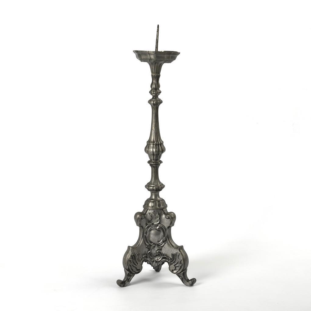 In Silberart gefertigter, großer Kerzenleuchter mit reicher Reliefzier und leeren Kartuschen auf allen Seiten des 3-seitigen Sockels. Schlanker Balusterschaft mit Riffelung sowie godronierte Tropfschale. Einige Alters-/Gebrauchsspuren.