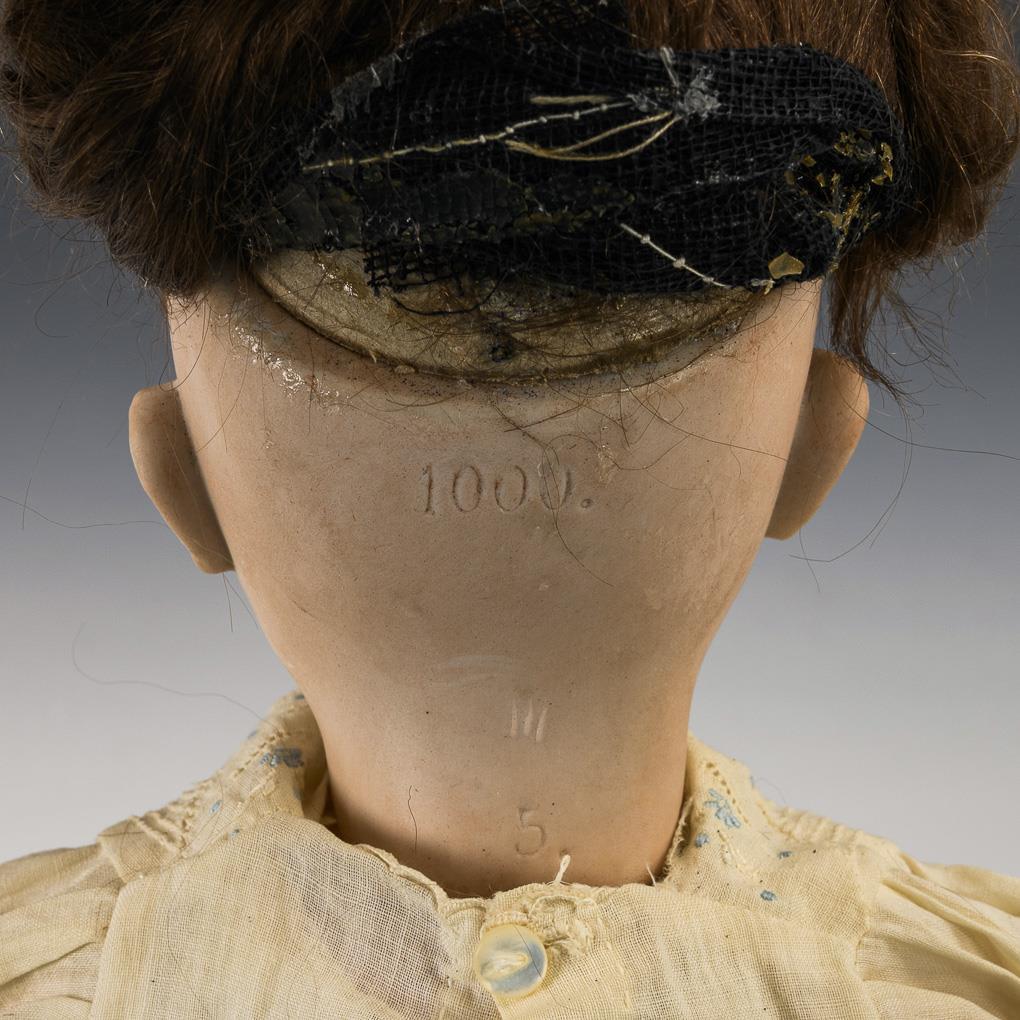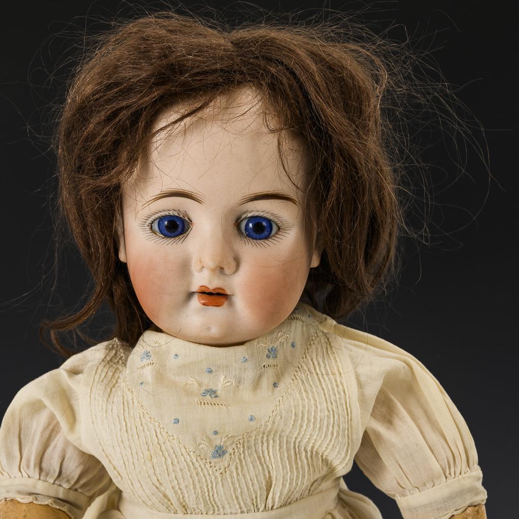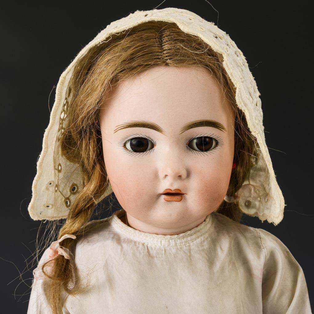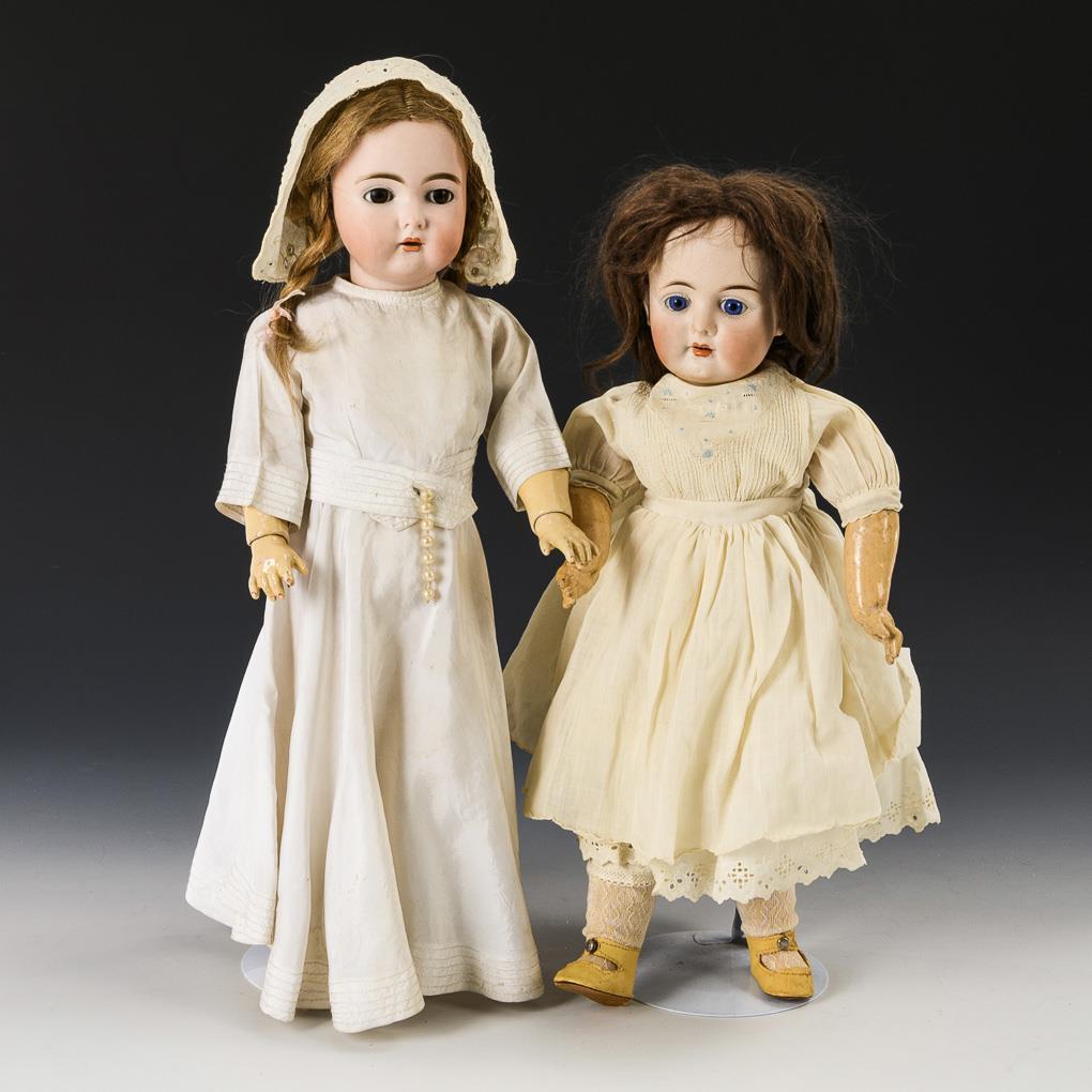 Blondes Puppenmädchen Cuno & Otto Dressel (gemarkt "C", Stempelziffer 89.42) mit braunen Schlafaugen, Ohrringen, Mohairperücke mit Zöpfen und 17-teiligem Gliederkörper. 1 winziger Chip am rechten Ohrläppchen, Körper übermalt. L 46 cm. / Kleineres Puppenmädchen (gemarkt "1000", unbekannter Hersteller) mit festen blauen Augen, brauner Mohairperücke und 9-teiligem Gliederkörper. Minimaler Perückenpull. L 41 cm. Köpfe durchleuchtet: ohne Risse.