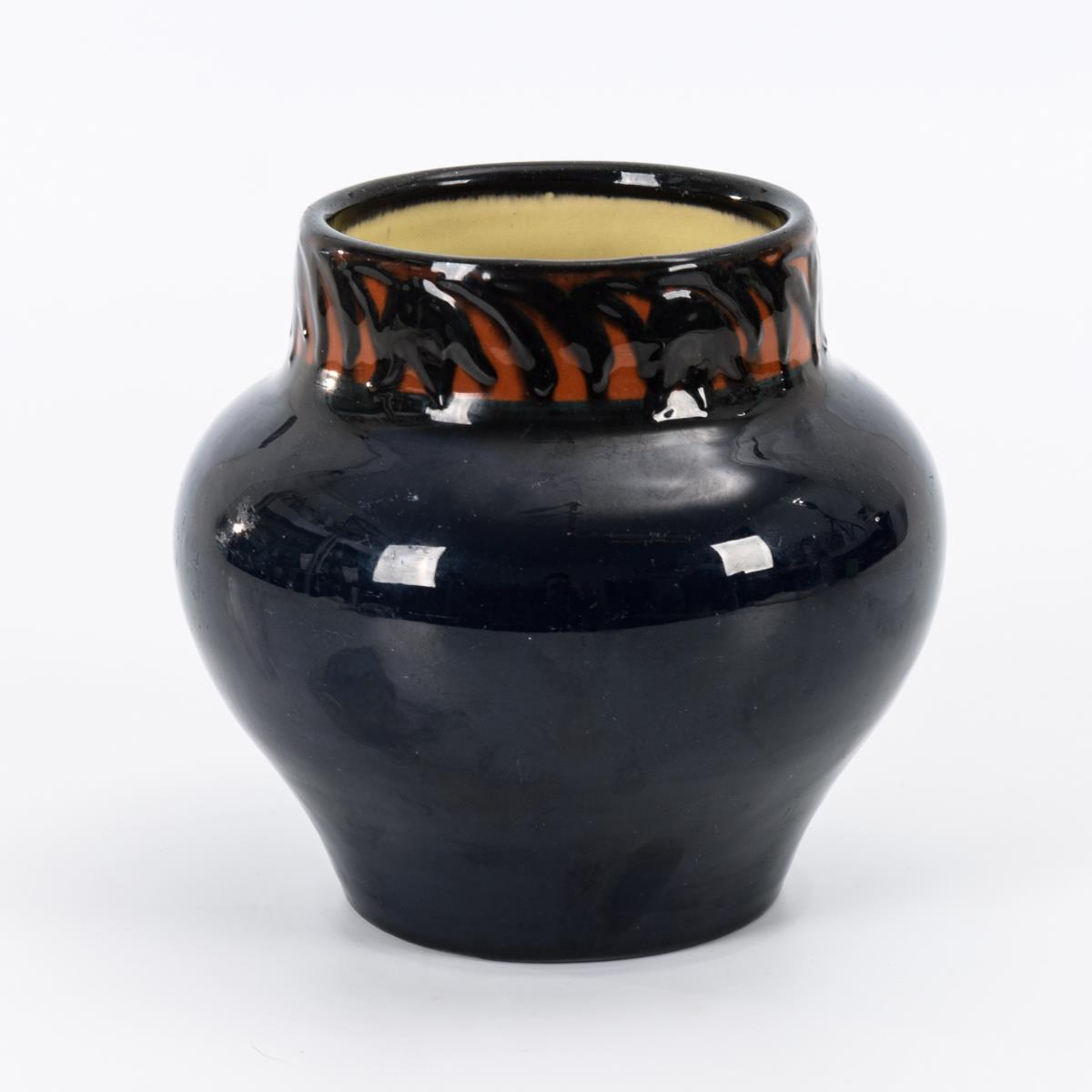 Gedrungene Balusterfom mit zylindrischem Hals, umlaufend florale Halsborte. Leichte Glasurbereibungen.